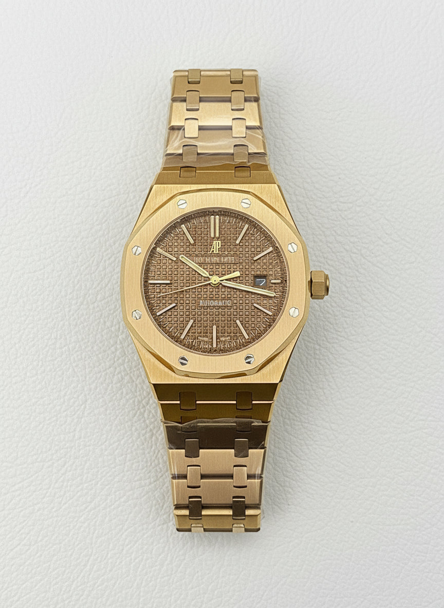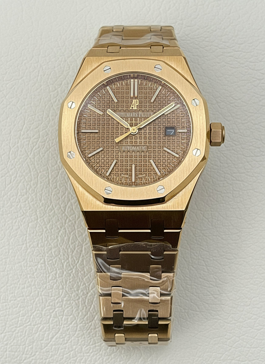 This Audemars Piguet Royal Oak–inspired watch is crafted in a luxurious rose gold finish and features a bold brown dial with the signature Royal Oak look. Designed with the iconic octagonal bezel and integrated bracelet style, this timepiece blends timeless luxury with modern sport appeal. A perfect statement watch for collectors and enthusiasts.