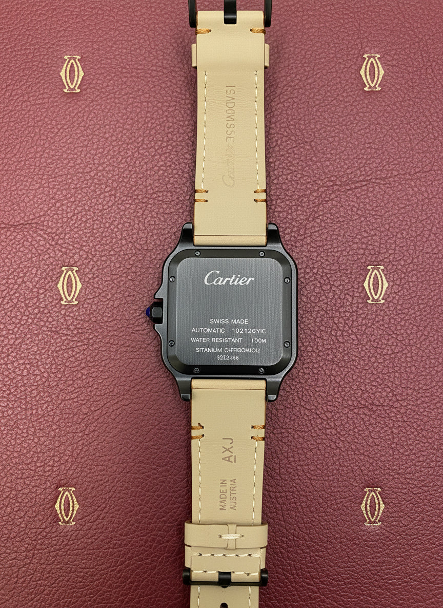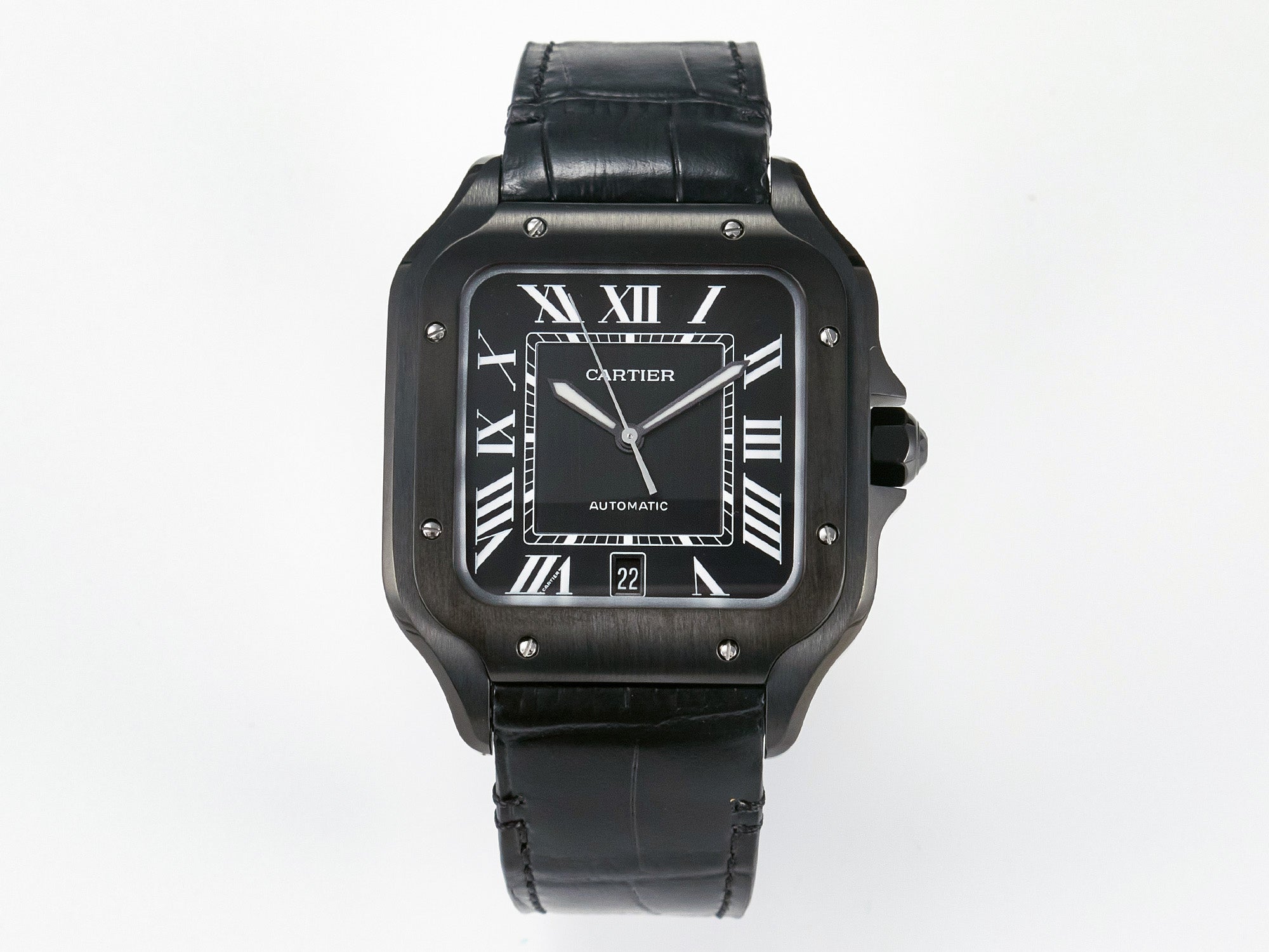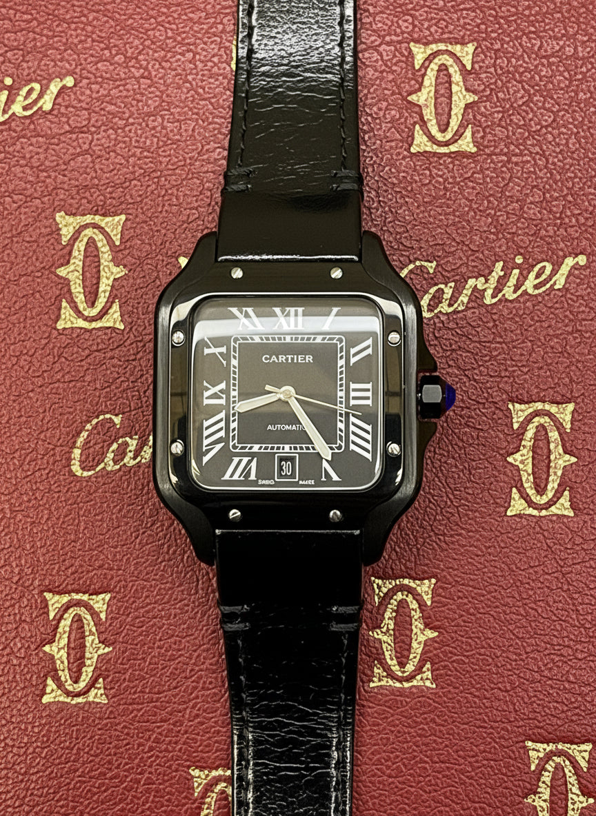 The Cartier Santos-Dumont inspired watch in a full black finish delivers bold sophistication with a modern edge. Featuring the iconic square case, exposed screws, and Roman numeral dial in an all-black design, this timepiece redefines minimal elegance. Its slim profile and sleek monochrome look make it perfect for both casual and formal wear.