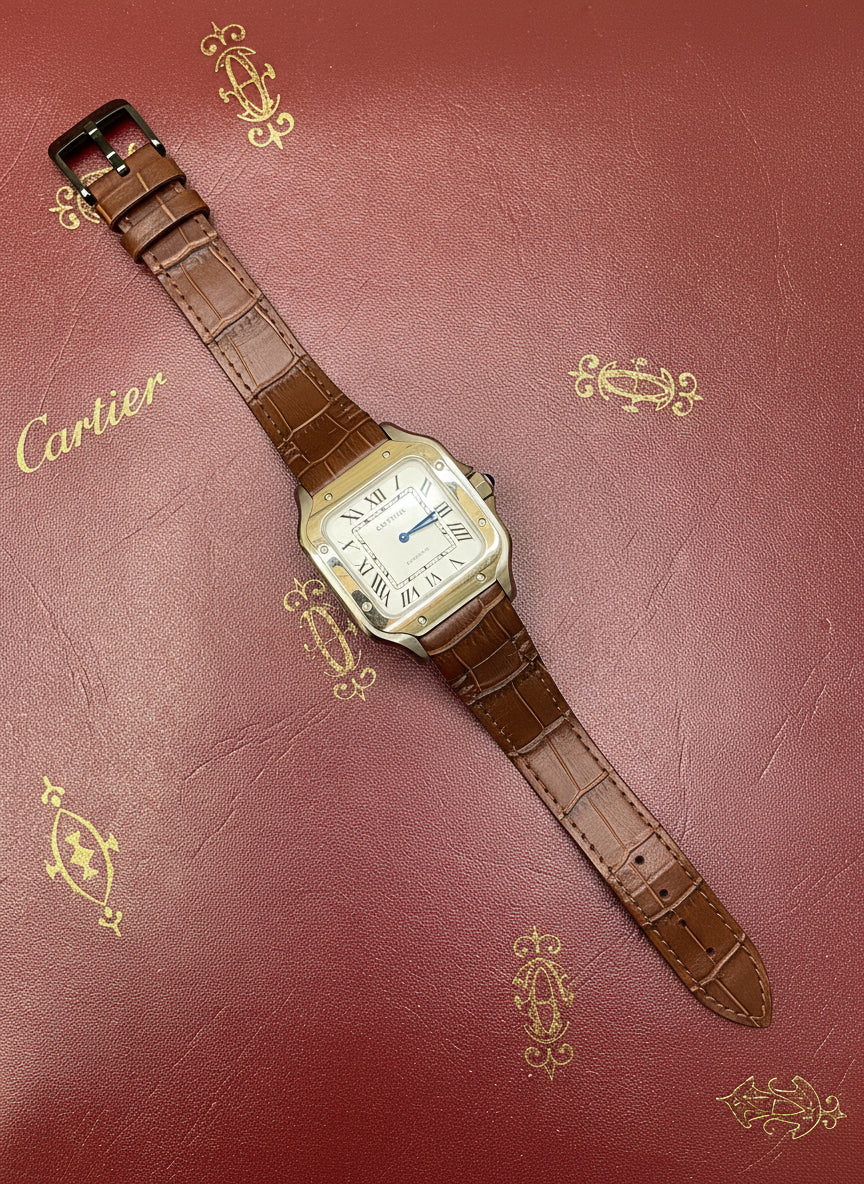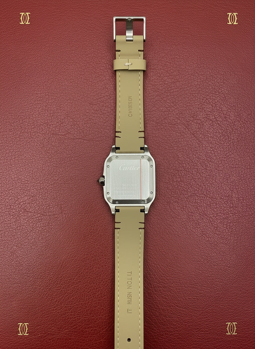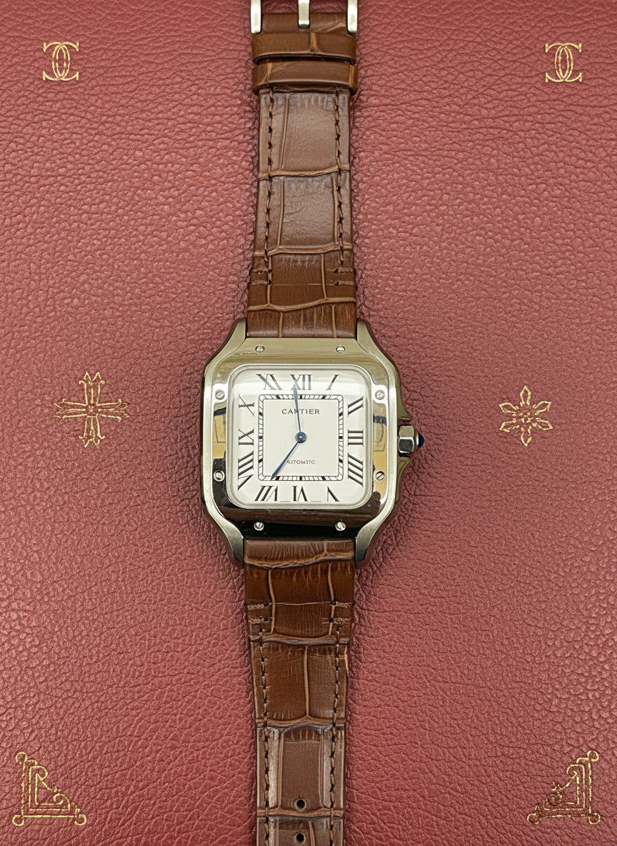 The Cartier Santos-Dumont inspired watch in stainless steel with a luxurious brown leather strap embodies timeless elegance in a larger, bolder size. Its iconic square case, exposed screws, and Roman numeral dial pay tribute to classic watchmaking while offering a modern, sophisticated presence on the wrist.