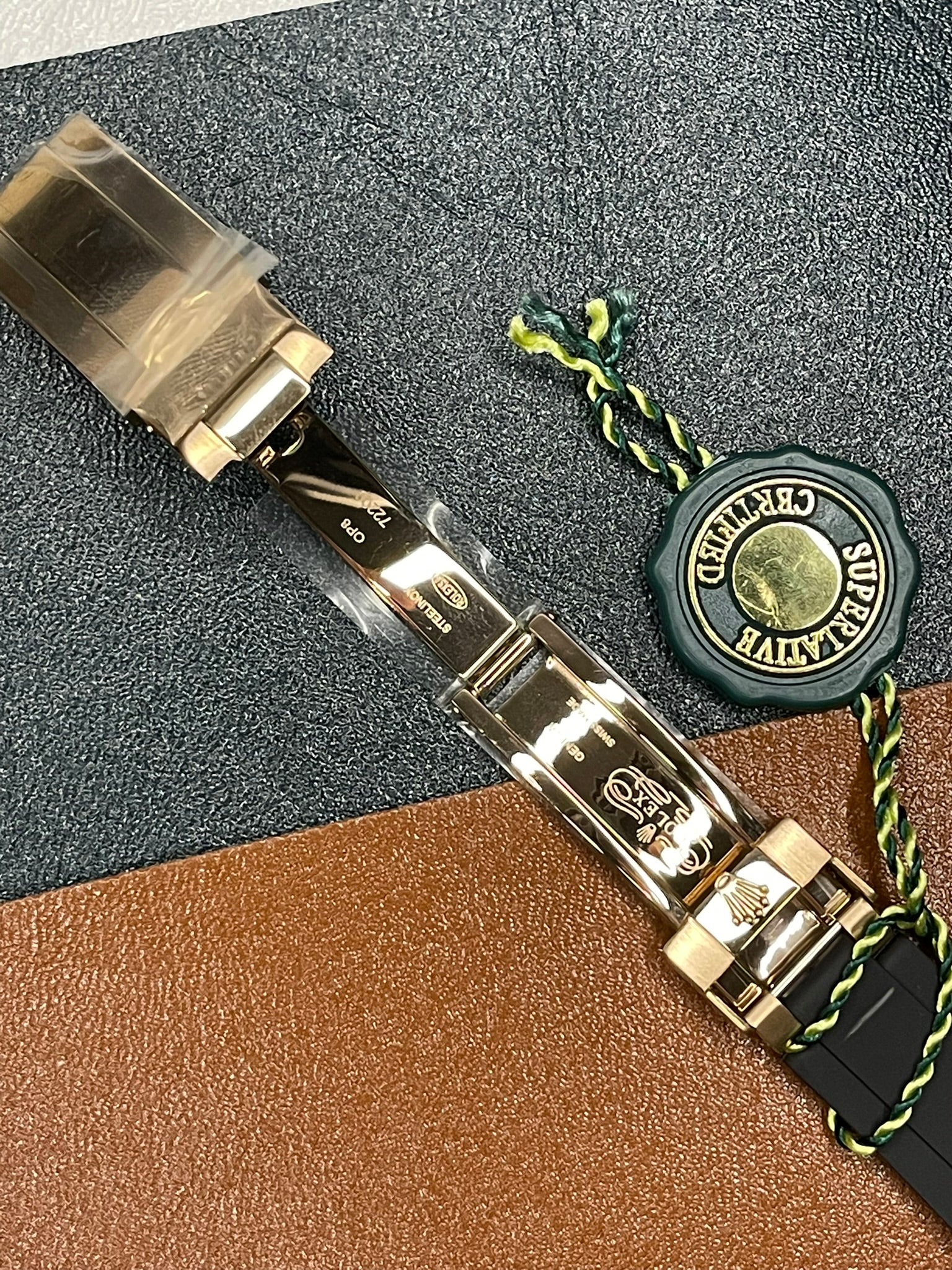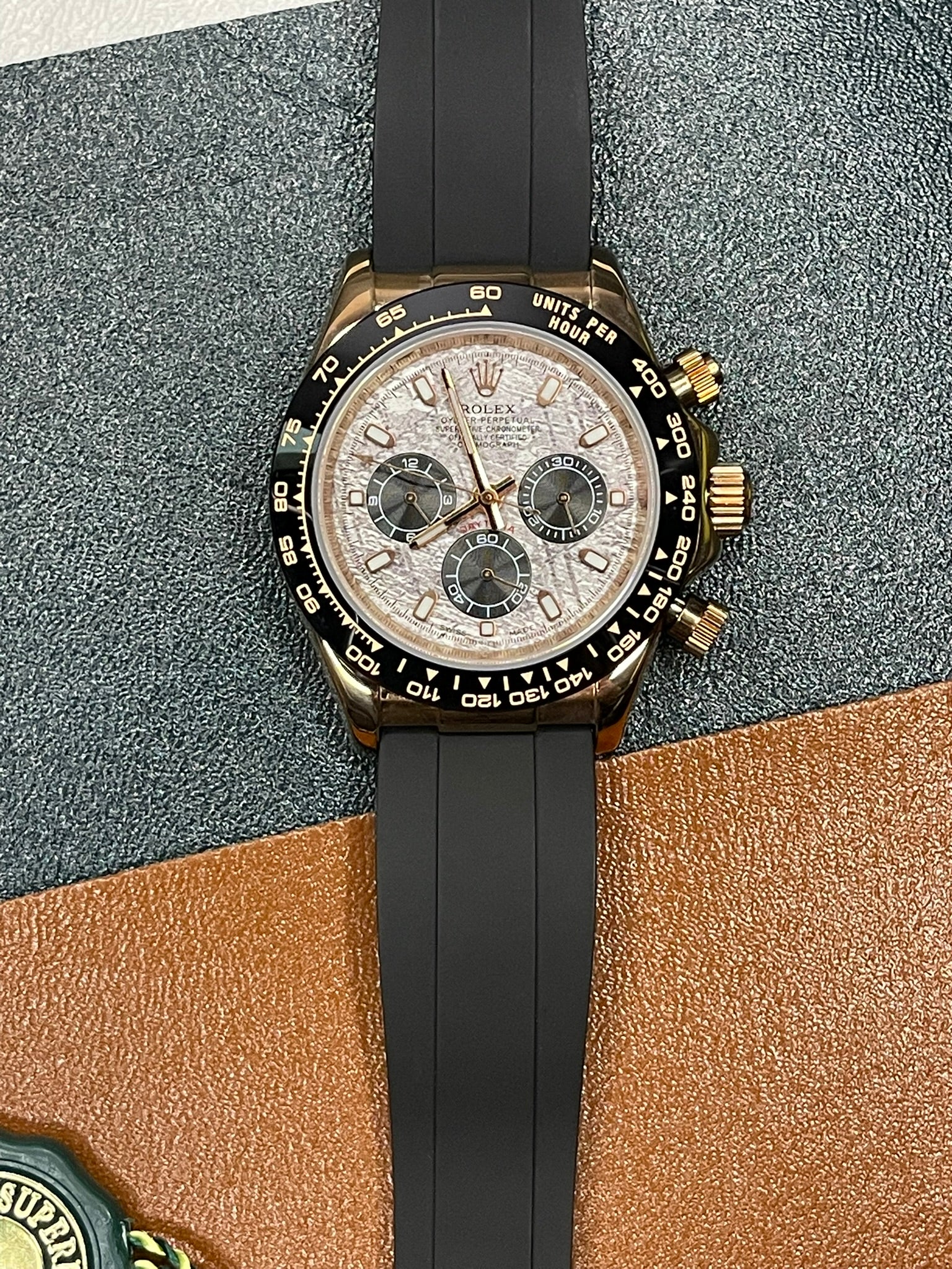 Bold, sporty, and unmistakably luxurious — this Cosmograph Daytona inspired watch features a rich rose gold finish paired with a sleek black Oysterflex-style rubber bracelet. Designed for performance and prestige, this timepiece blends motorsport heritage with modern elegance.