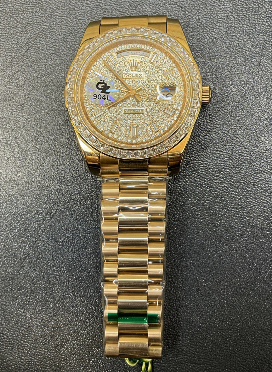 The 40mm case in 18k Rose Gold radiates sophistication, while the diamond-paved dial and bezel add brilliance from every angle. Built with automatic movement, the Day-Date ensures flawless precision along with day and date display at 12 and 3 o’clock.