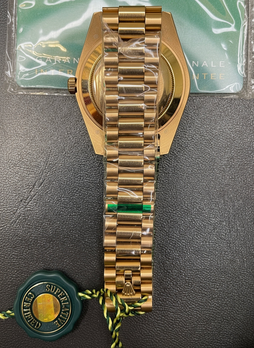 Make a statement of prestige with the Day-Date 40mm in Rose Gold, fully iced out with diamonds on the bezel and dial. Paired with the iconic President bracelet, this masterpiece reflects unmatched luxury and timeless elegance.