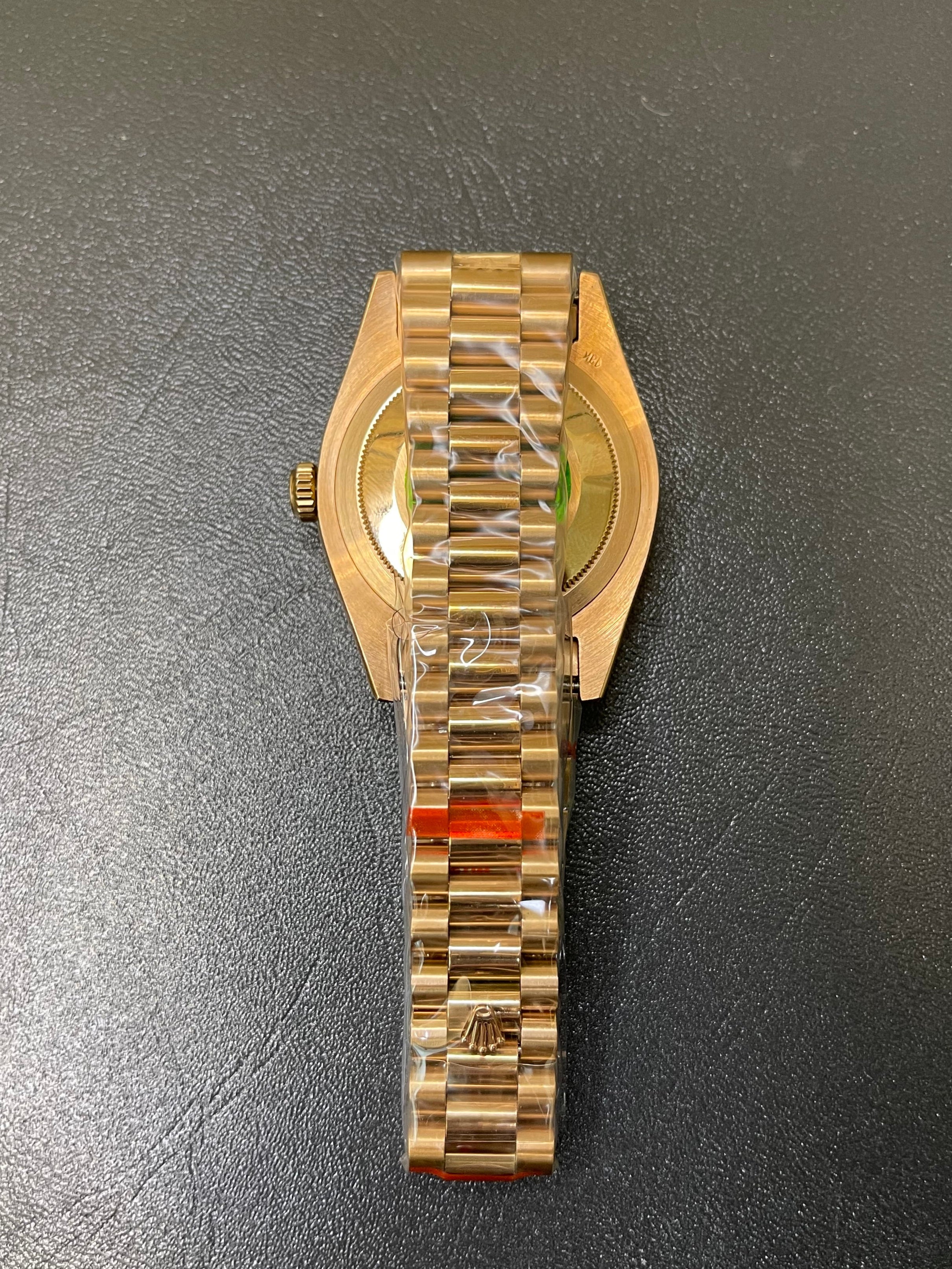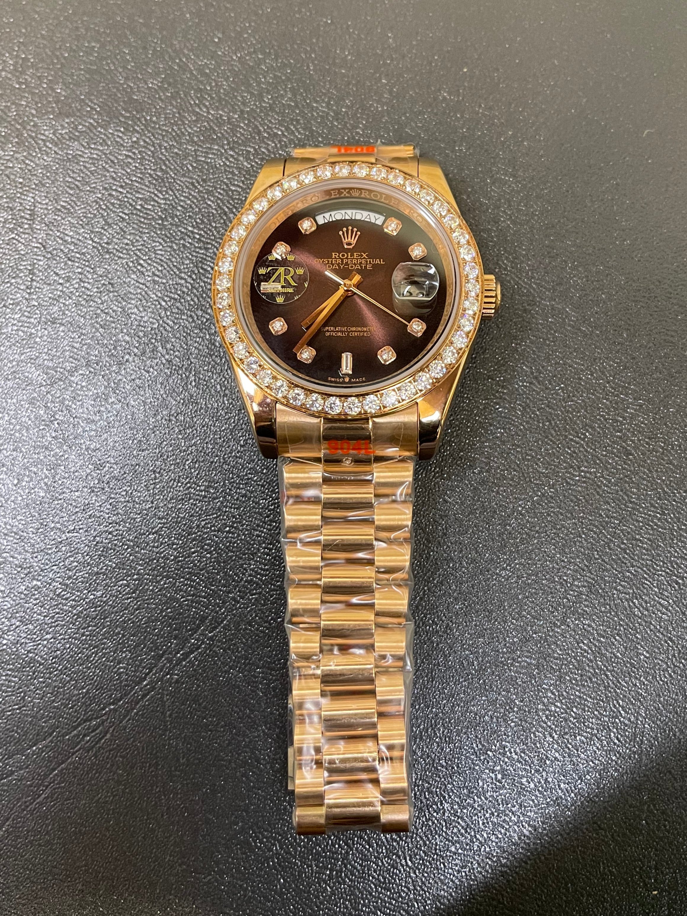 The Day-Date inspired watch in rose gold with a rich coffee color dial and a dazzling stone-set bezel is a perfect blend of elegance and luxury. Featuring the iconic presidential bracelet and a bold design, this timepiece adds sophistication to any look.