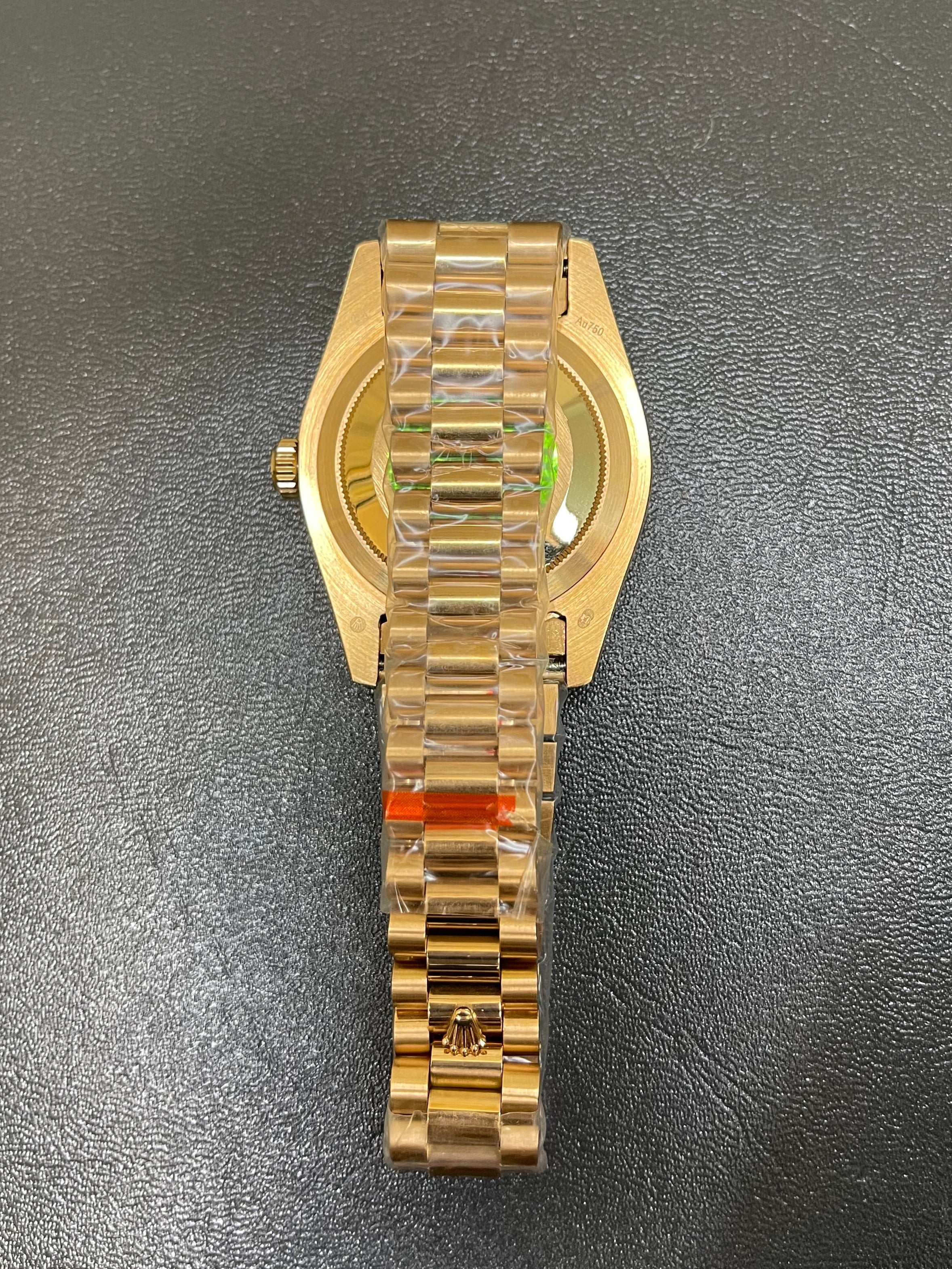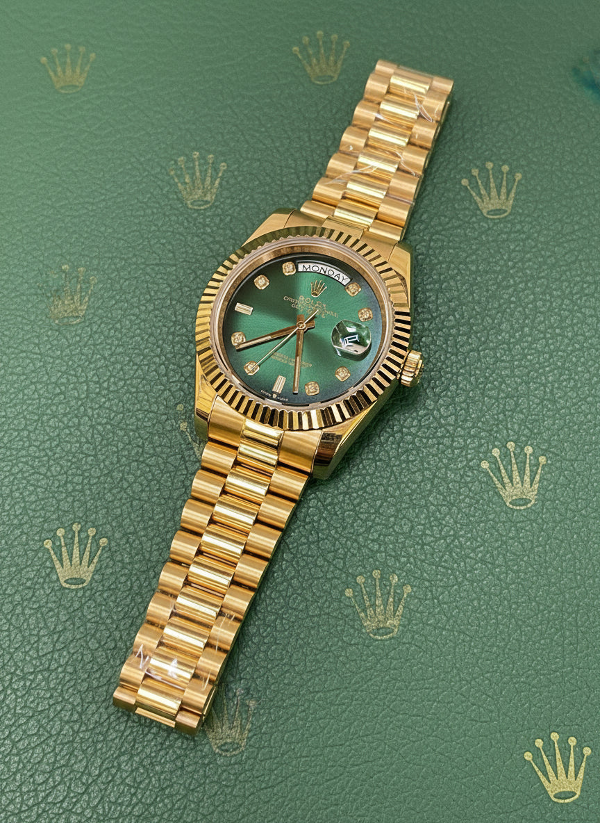 The Day-Date inspired watch in rose gold with a bold green dial and a sparkling is the ultimate expression of modern luxury. Paired with the signature presidential bracelet, this timepiece blends classic elegance with a fresh, standout style.