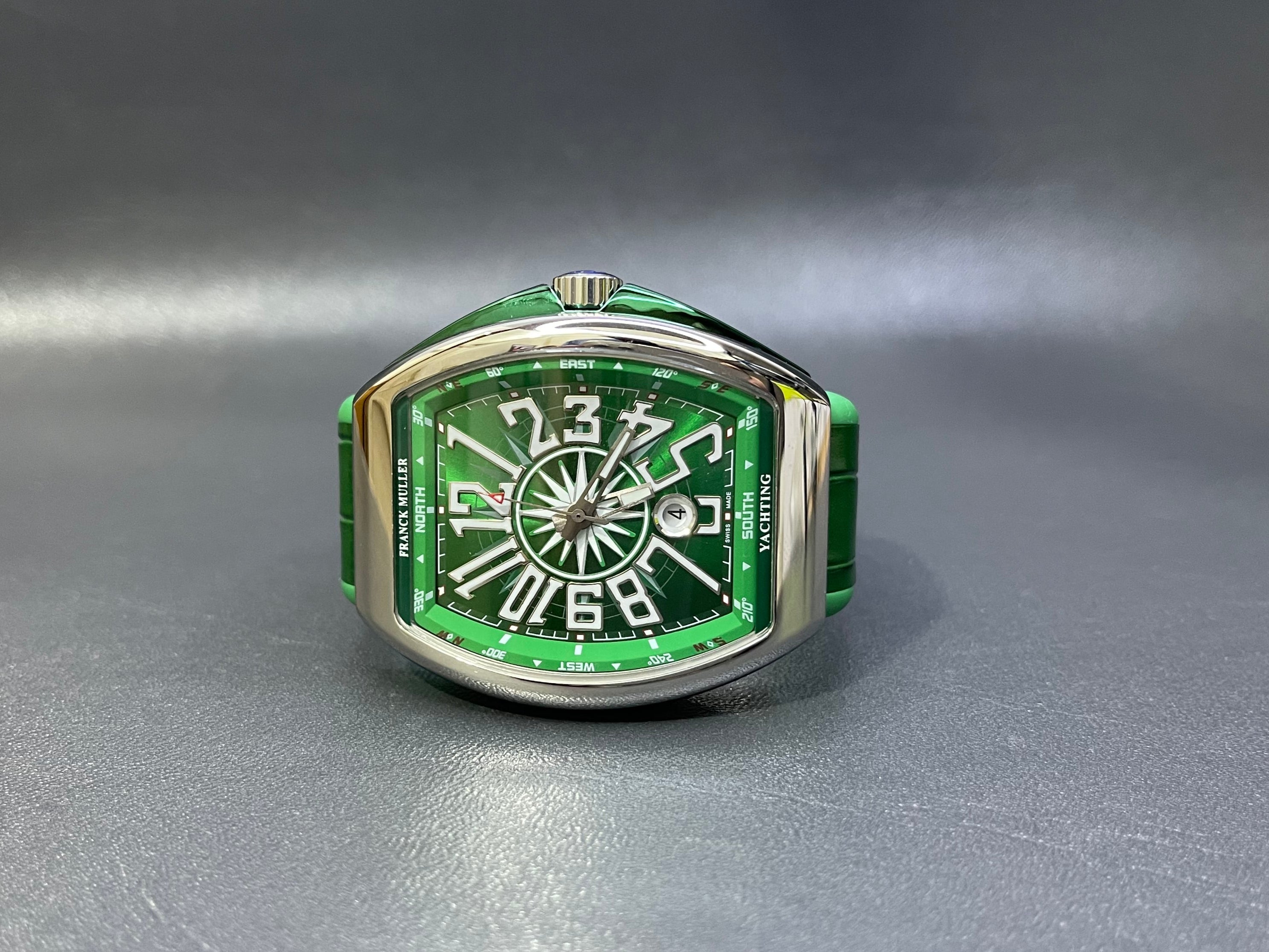 Stand out with the Franck Muller Vanguard Yachting Edition in a bold green dial housed in a sleek stainless steel case. Inspired by the spirit of sailing, this luxury timepiece combines precision engineering with daring style. The tonneau-shaped Vanguard case and nautical design details create a watch that is both modern and timeless.
