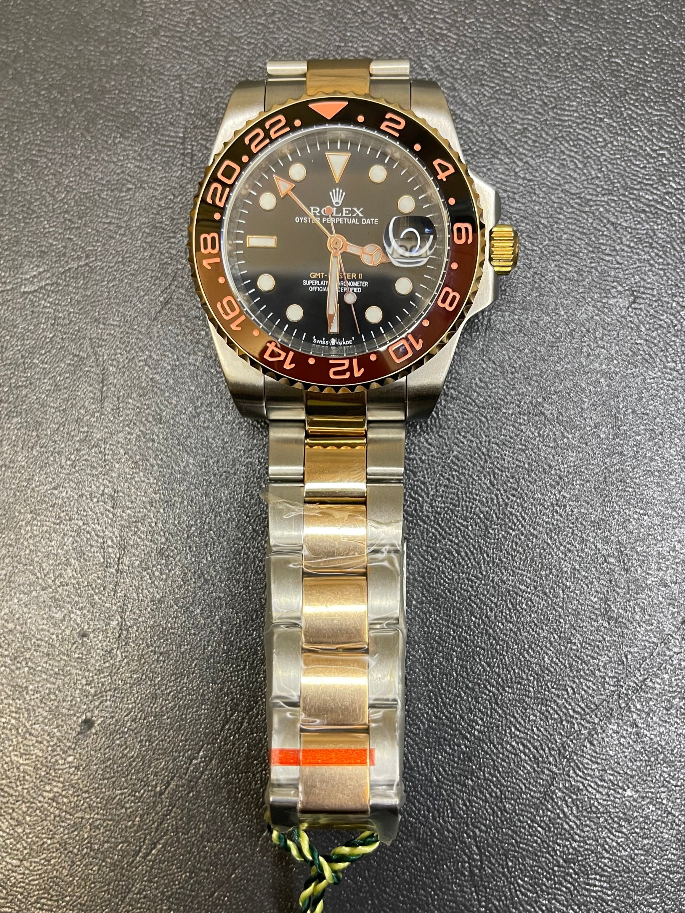 Discover the perfect mix of bold elegance and travel-ready functionality with this GMT-Master II “Root Beer” style watch, featuring a striking rose gold and stainless steel case, a warm-toned brown and black ceramic bezel, and the iconic Oyster bracelet for a sleek, sport-luxury look.