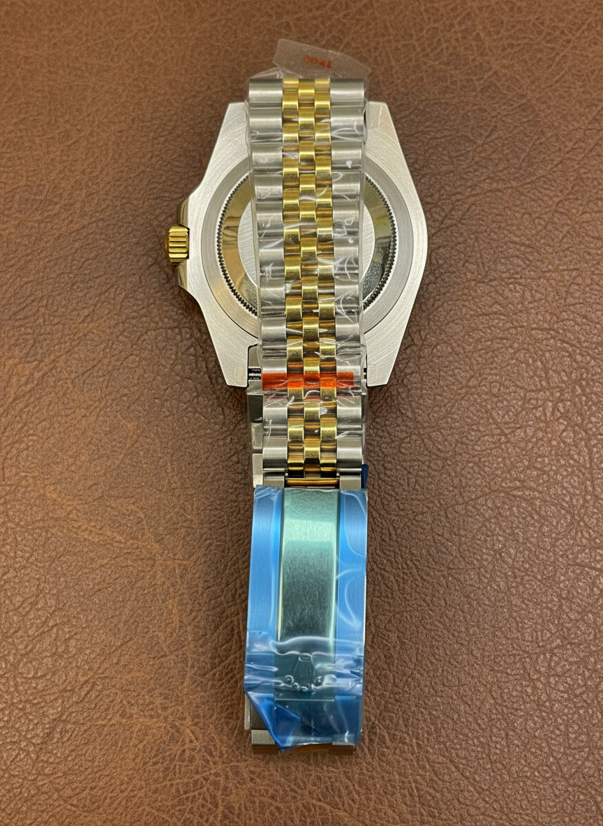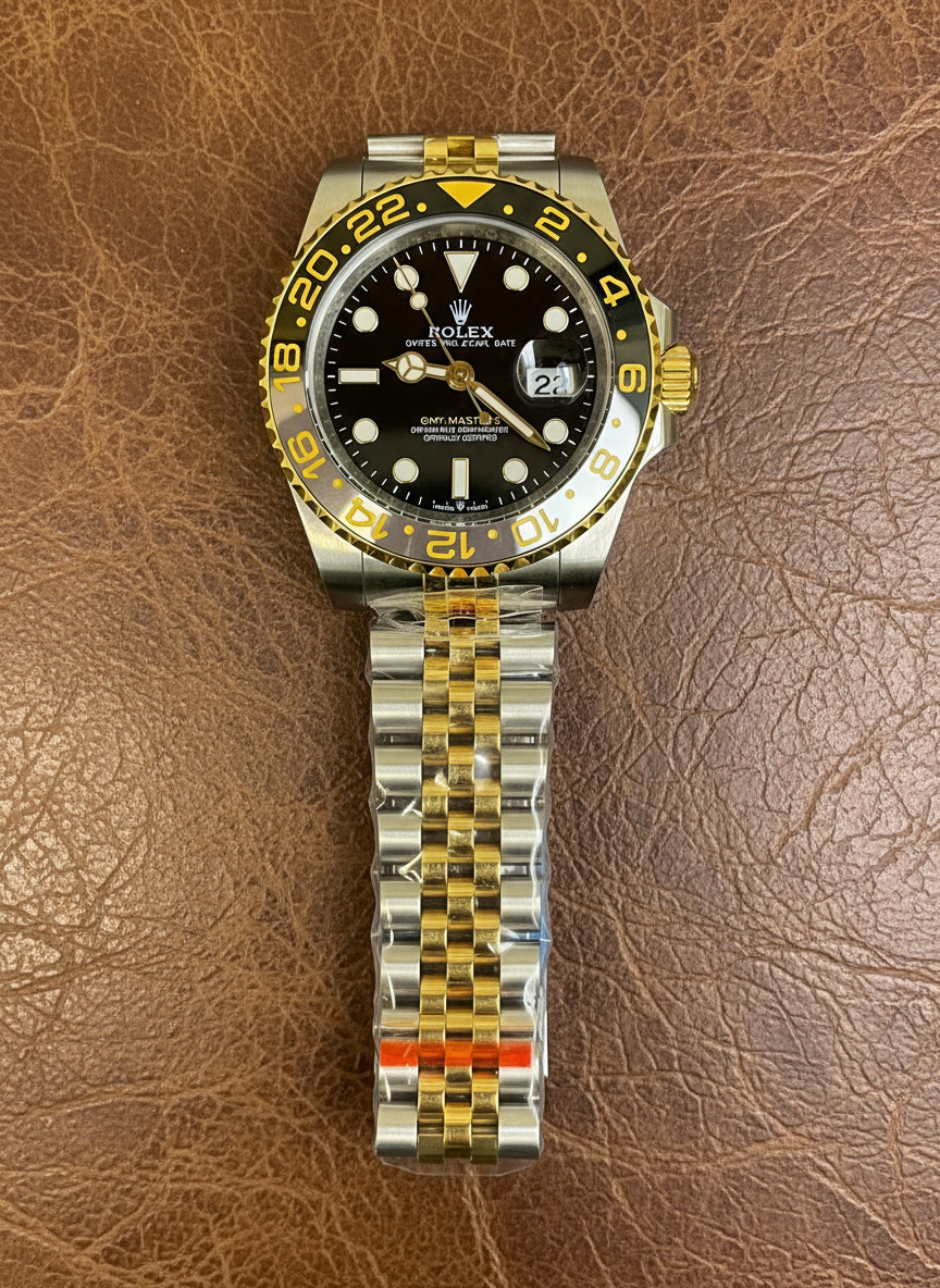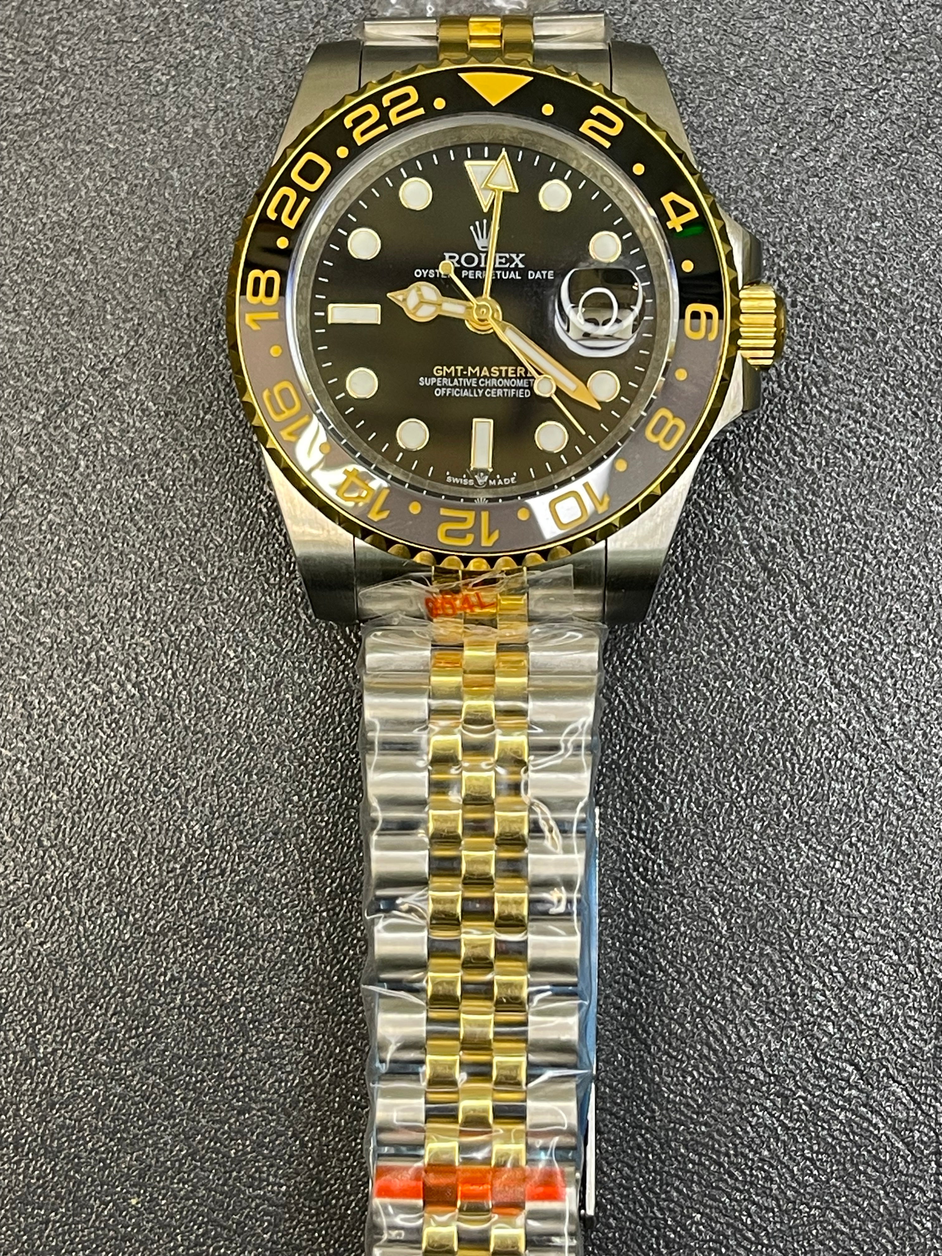 Showcase refined strength and versatility with this GMT-Master II inspired watch, featuring a bold black and gold ceramic bezel, classic black dial, and polished two-tone Jubilee bracelet. Designed for global explorers and professionals, this luxury-style timepiece includes a dual time zone (GMT) function, luminous hands, and a date window with magnifying lens for added precision.