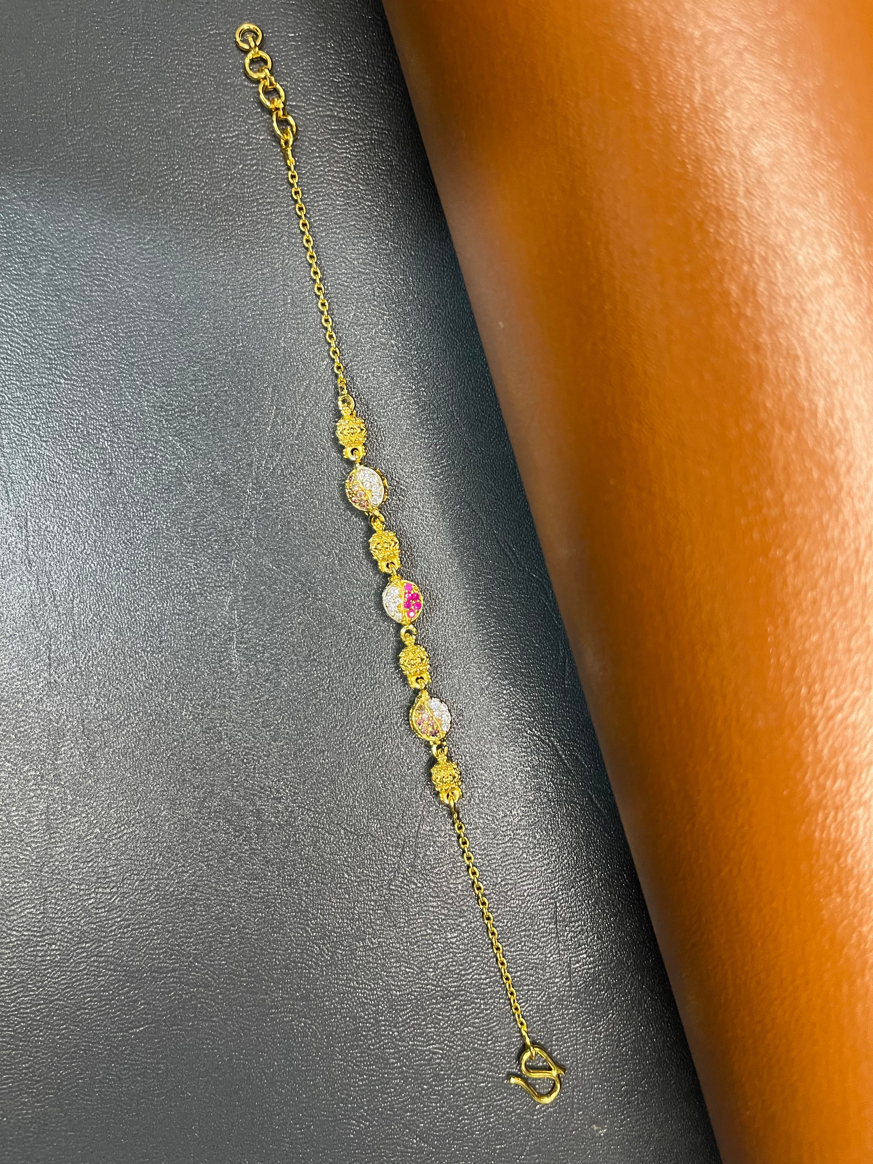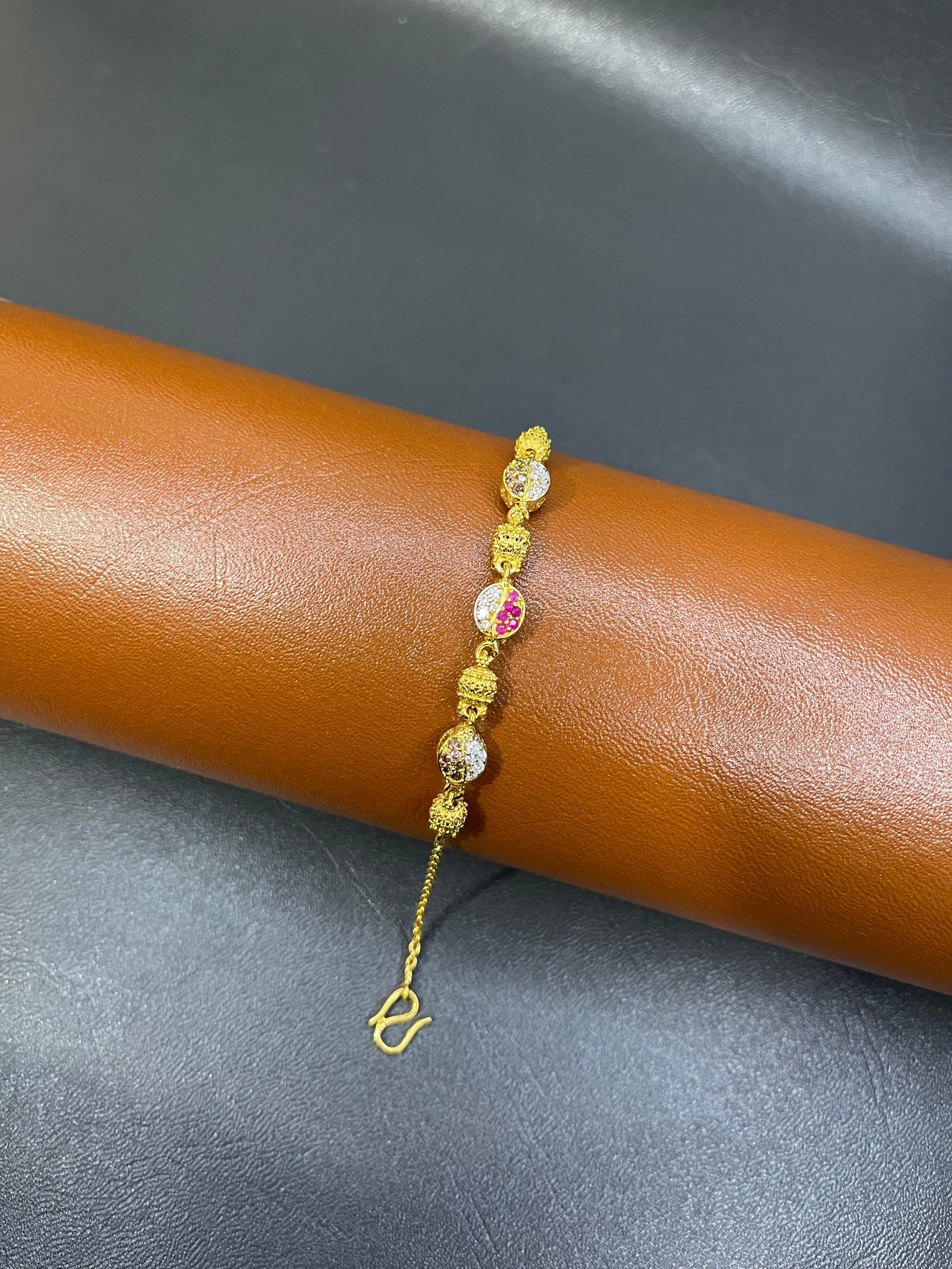 Add sparkle and elegance with this gold-plated 925 silver bracelet, featuring a unique combination of four gold-plated silver balls and two floral leaf design pieces adorned with zircon and purple stones, and a centerpiece red stone with zircon accents. This intricate design creates a luxurious and eye-catching statement piece.