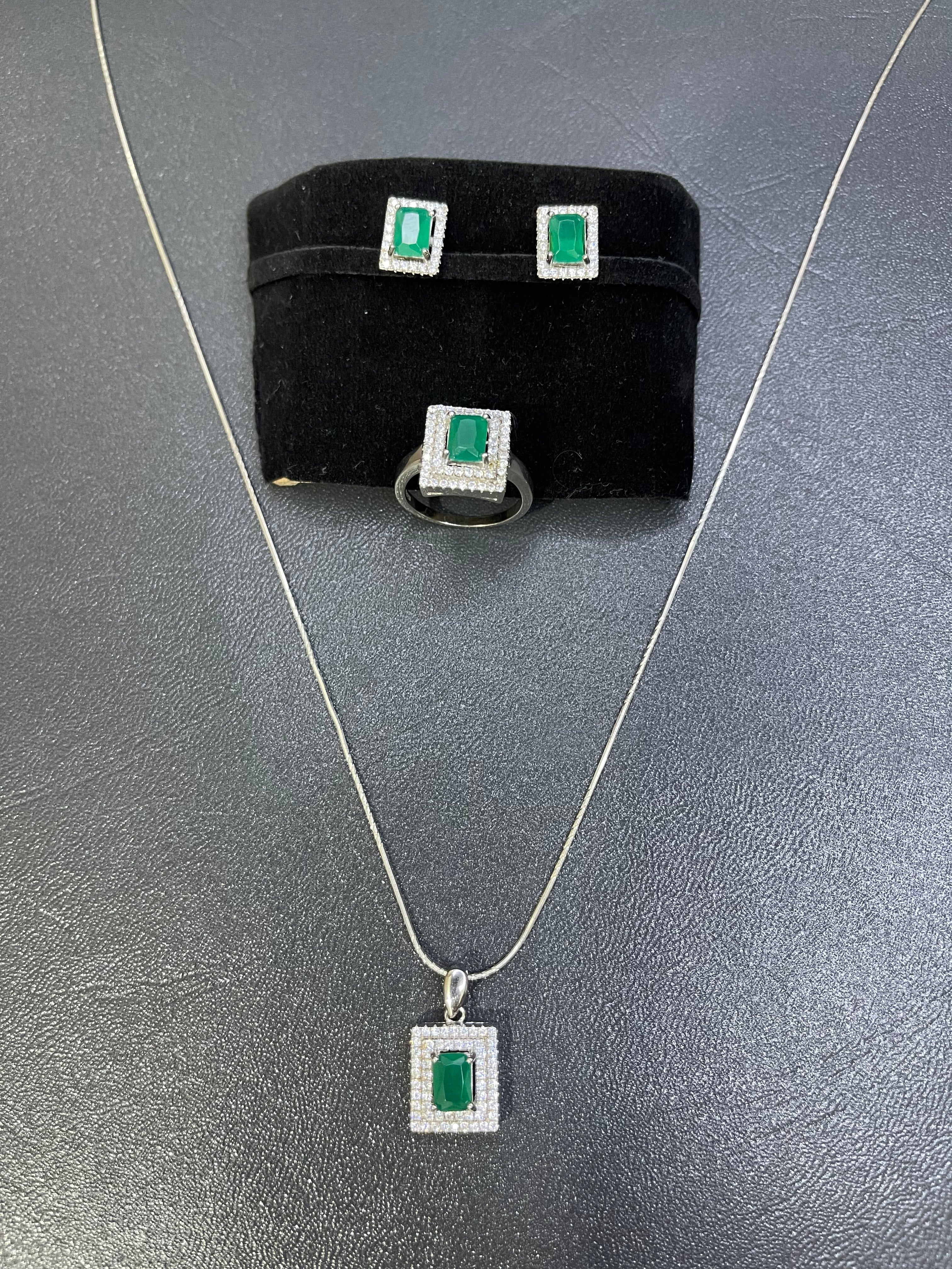Elevate your elegance with this Green Stone Jewelry Set crafted in 925 sterling silver. The set includes a locket, matching tops, and a ring, each beautifully adorned with a vibrant green center stone surrounded by a sparkling zircon frame. Designed to bring a luxurious yet graceful touch, this set is perfect for formal occasions or everyday wear.
