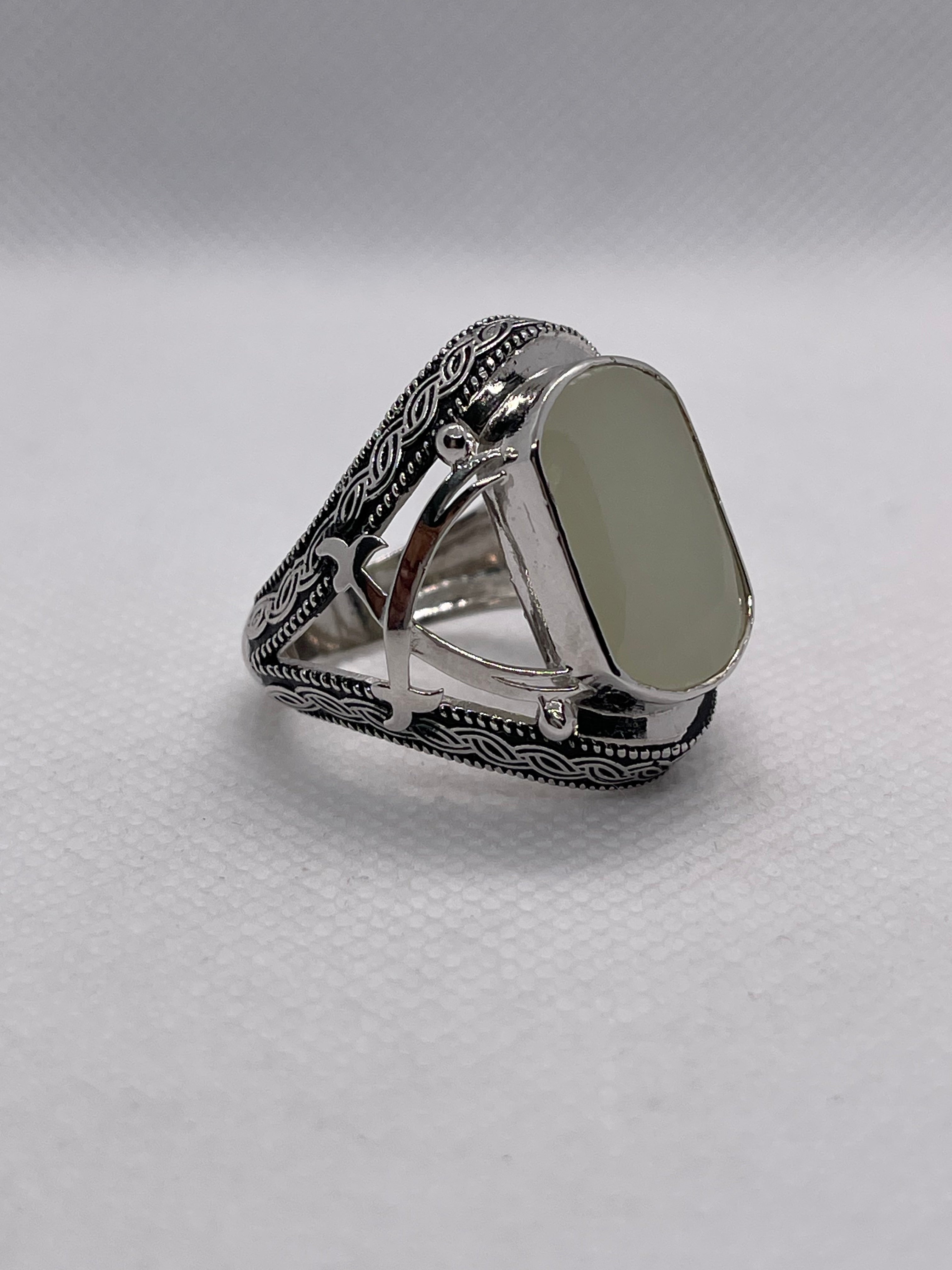 Showcase strength and elegance with this 925 silver men’s ring featuring a rare white Aqeeq stone at its center. The bold 2 Shamshir (sword) design adds a touch of power and tradition, while the handcrafted detailing makes it a standout accessory. Perfect for men who value both style and heritage.