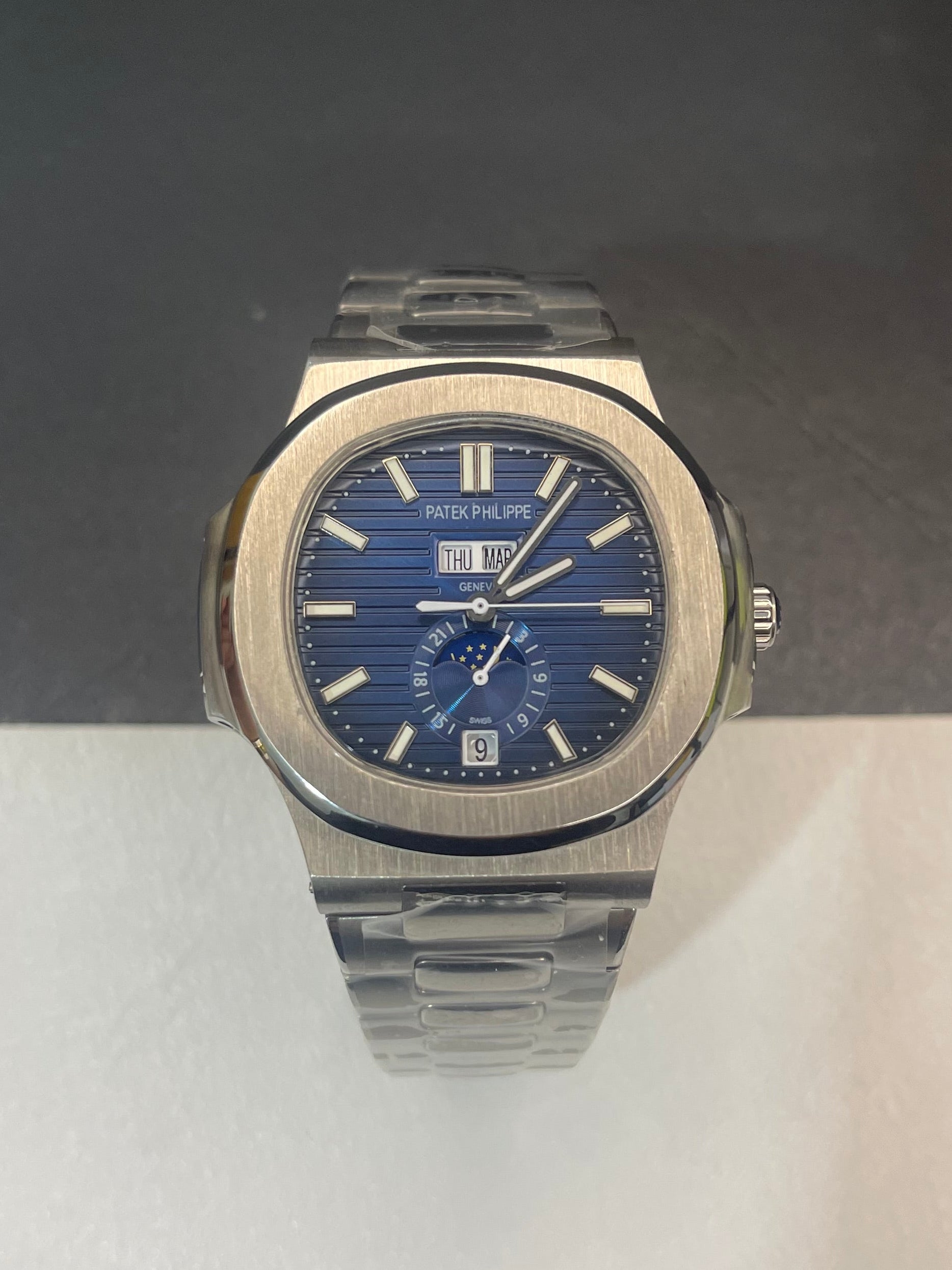 Elegant and technically sophisticated, the Nautilus Annual Calendar Watch features a refined blue dial paired with the iconic Nautilus case design. This timepiece combines timeless aesthetics with practical complications, including an annual calendar and moon phase display, making it both visually captivating and highly functional.