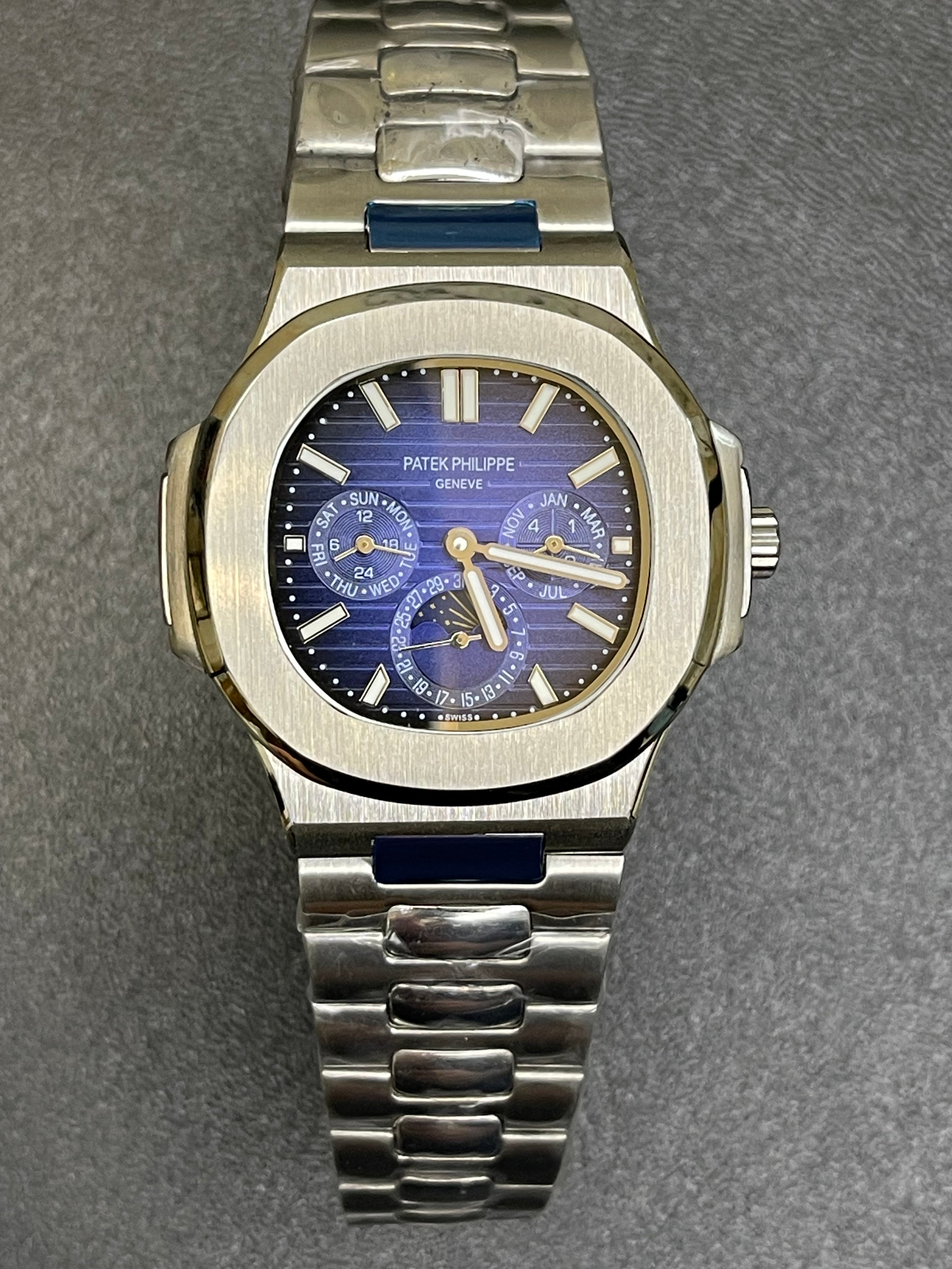 Redefine elegance with this Nautilus-inspired Perpetual Calendar watch, featuring a stunning deep blue dial and a sleek, modern case. With its refined layout of day, date, month, and moon phase indicators, this timepiece embodies the essence of precision and sophistication. The clean design, combined with its automatic movement and stainless steel bracelet, offers both style and functionality for collectors and professionals alike.