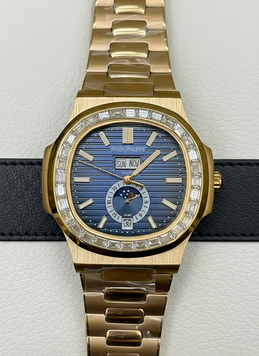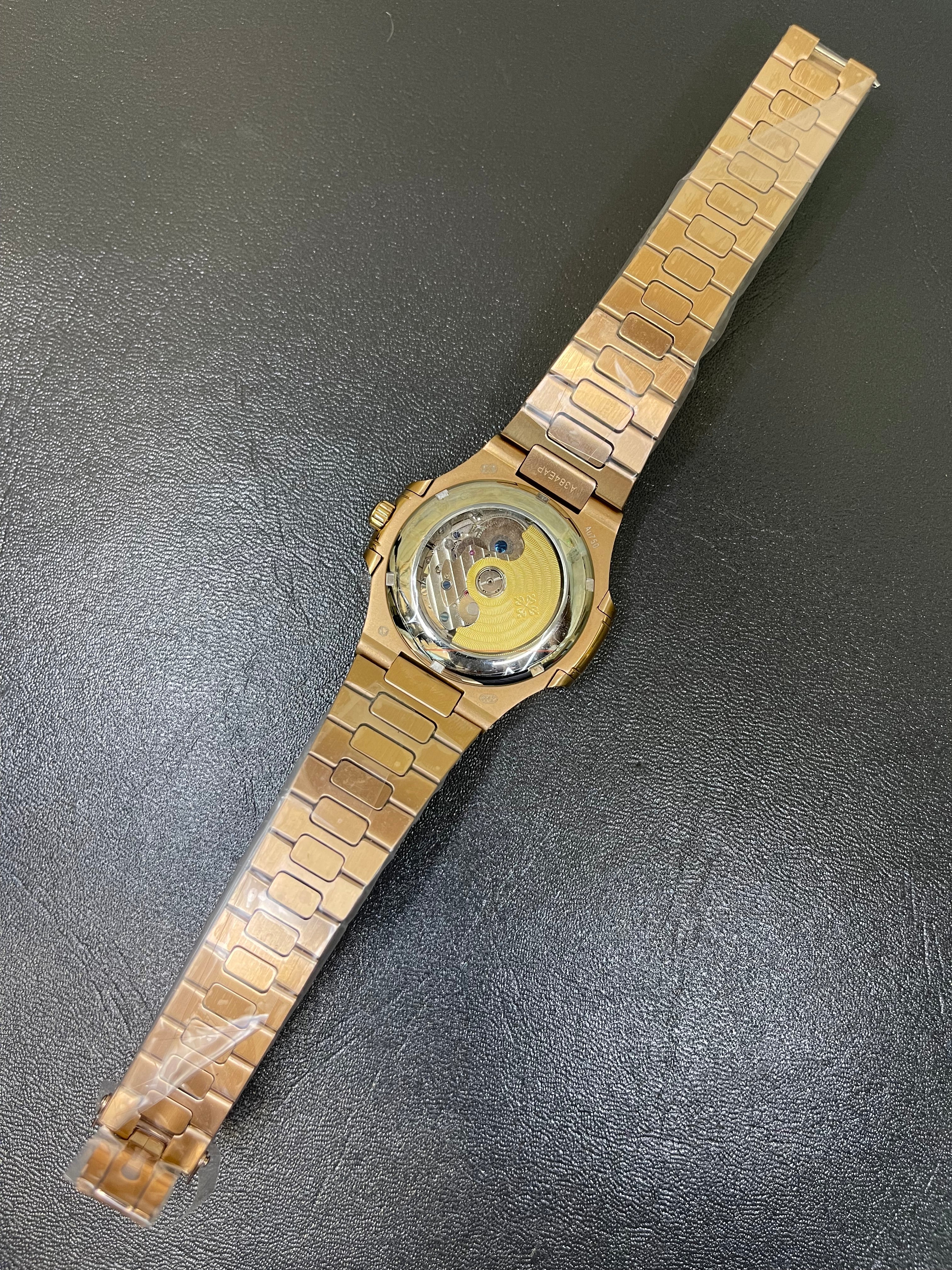 Elevate your collection with this Patek Philippe Nautilus–inspired masterpiece featuring a luxurious rose gold case and a striking blue dial. Designed with day-date and moonphase complications and finished with a stone-encrusted bracket bezel, this watch captures the essence of Nautilus elegance while adding a modern, luxurious twist. Perfect for collectors and style enthusiasts.