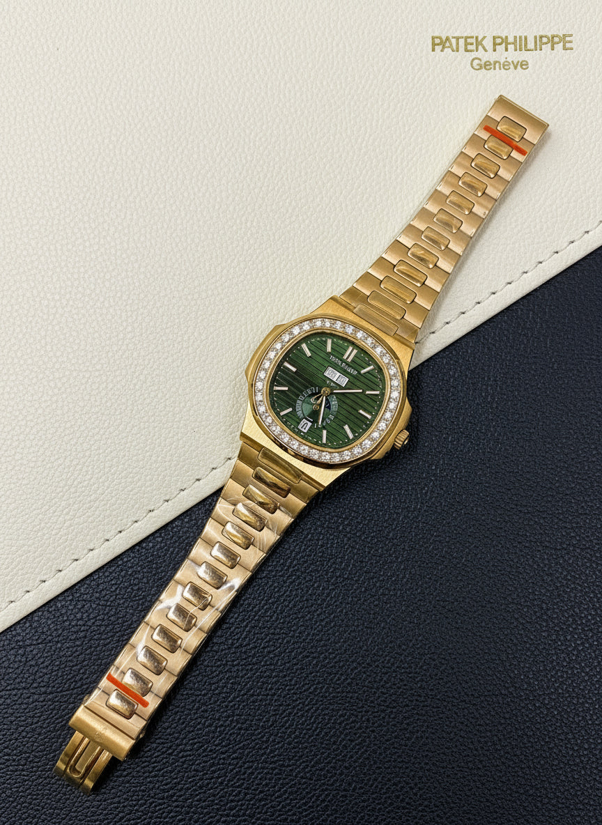 Experience the perfect balance of elegance and innovation with this Patek Philippe Nautilus–inspired timepiece. Crafted in rose gold tone, it features a bold green dial with day-date and moonphase functions, paired with a stunning stone-encrusted bracket bezel. This watch embodies the luxury spirit of the Nautilus line, blending timeless style with modern complication.