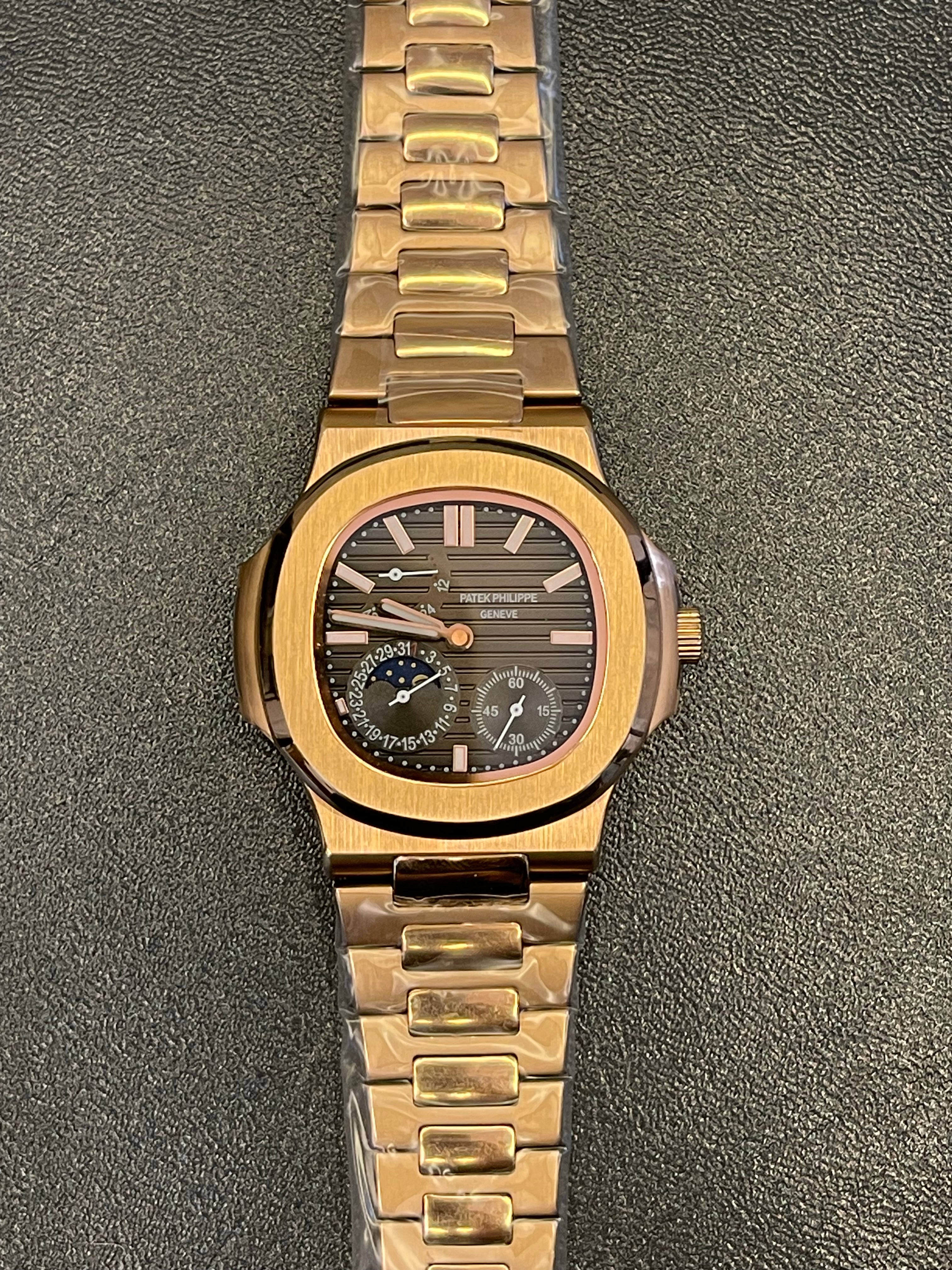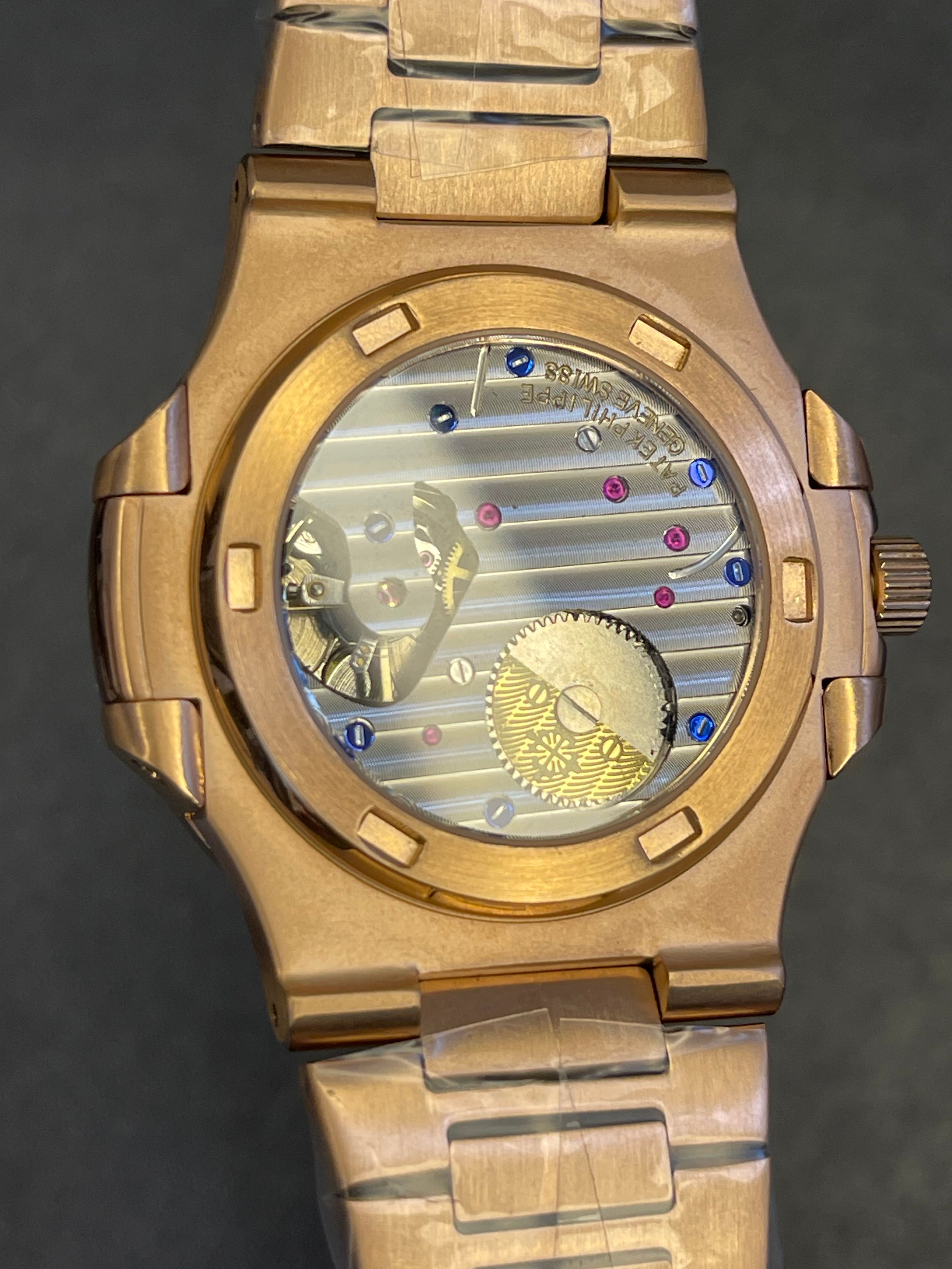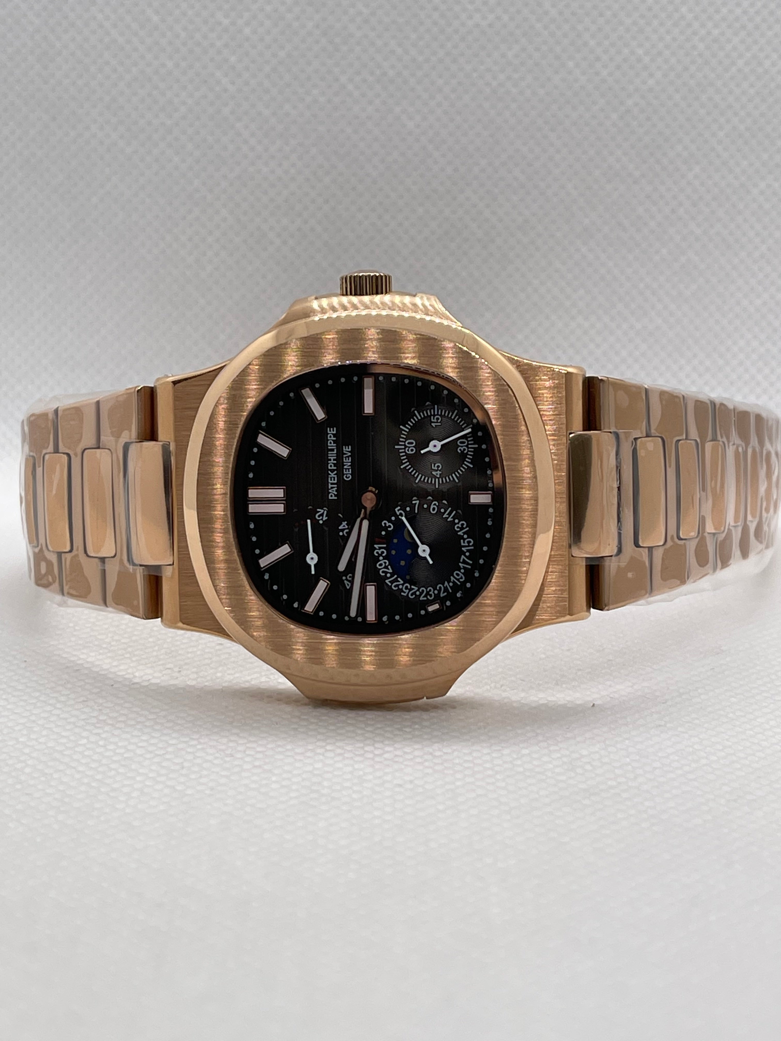 Discover unmatched craftsmanship with the 2024 Nautilus 5712/1R-001 style watch, a masterpiece of rose gold-tone elegance, complete with a moon phase complication, power reserve indicator, and date subdial. Inspired by one of the most coveted timepieces in the world, this model brings together refined horology and iconic Nautilus design.