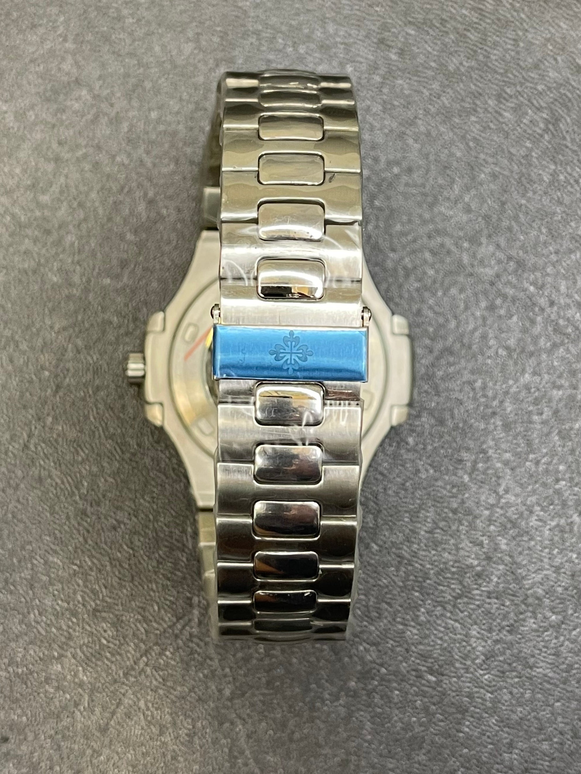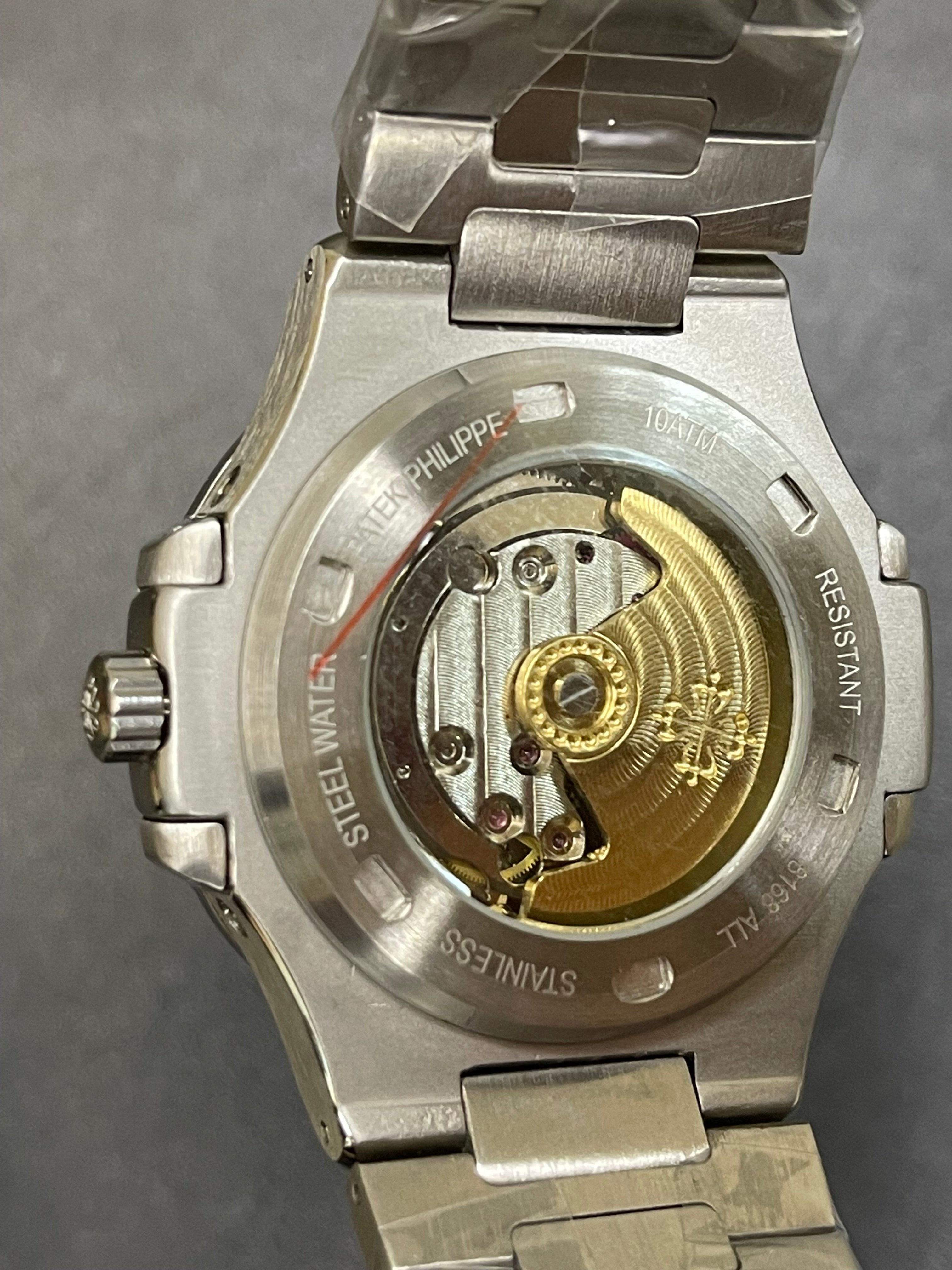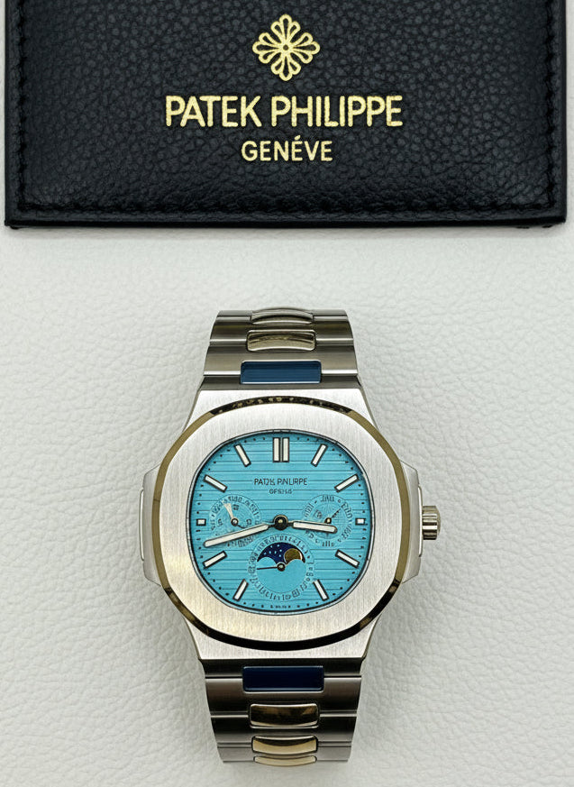 Add a rare and striking piece to your collection with this Nautilus-inspired watch, featuring the iconic Tiffany blue dial and a refined moon phase display. This luxury-style timepiece blends modern elegance with classic complication — offering a calendar layout with day, date, and month indicators, all housed in a sleek case with automatic movement for precision and performance.