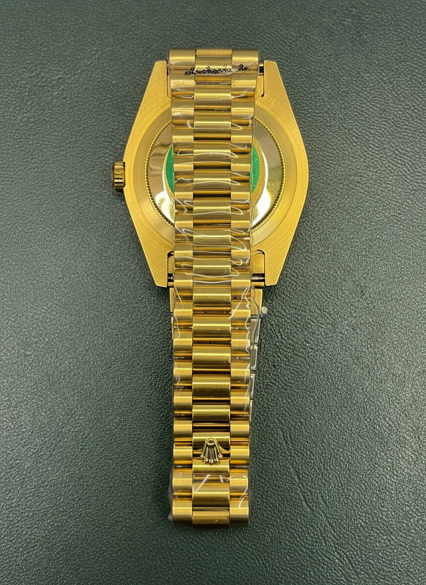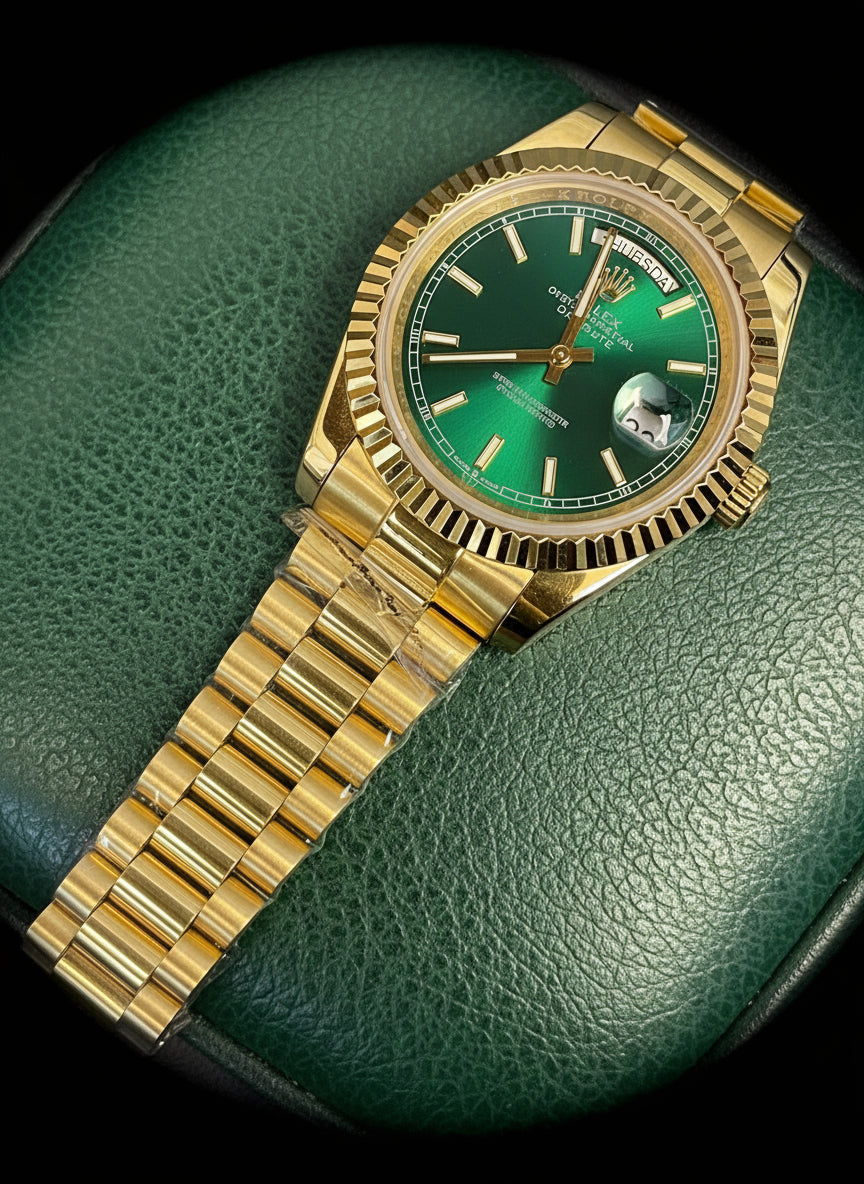 Make a bold and regal statement with this Day-Date 40-inspired timepiece, featuring a rich yellow gold-tone case and a signature green Roman numeral dial. Known for its classic prestige and timeless style, this luxury watch is paired with a polished President-style bracelet, automatic movement, and full calendar display — the perfect blend of elegance and authority.