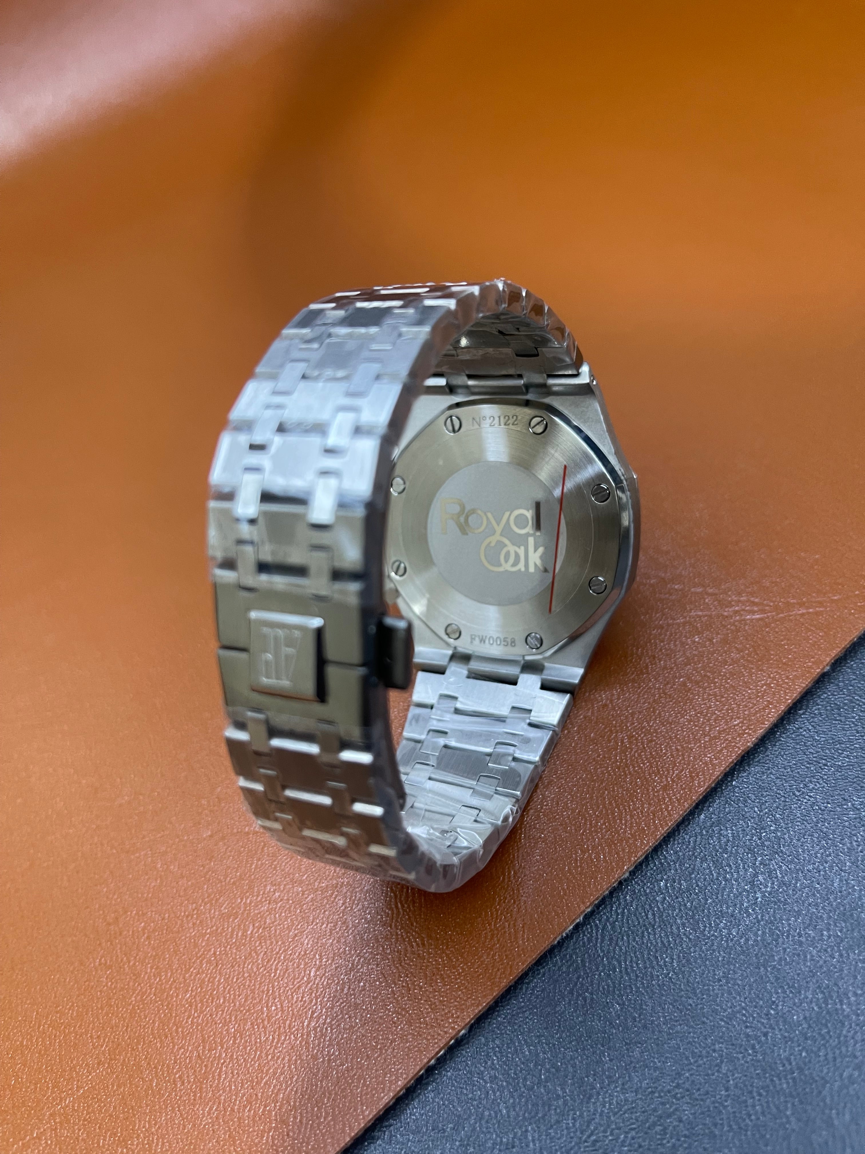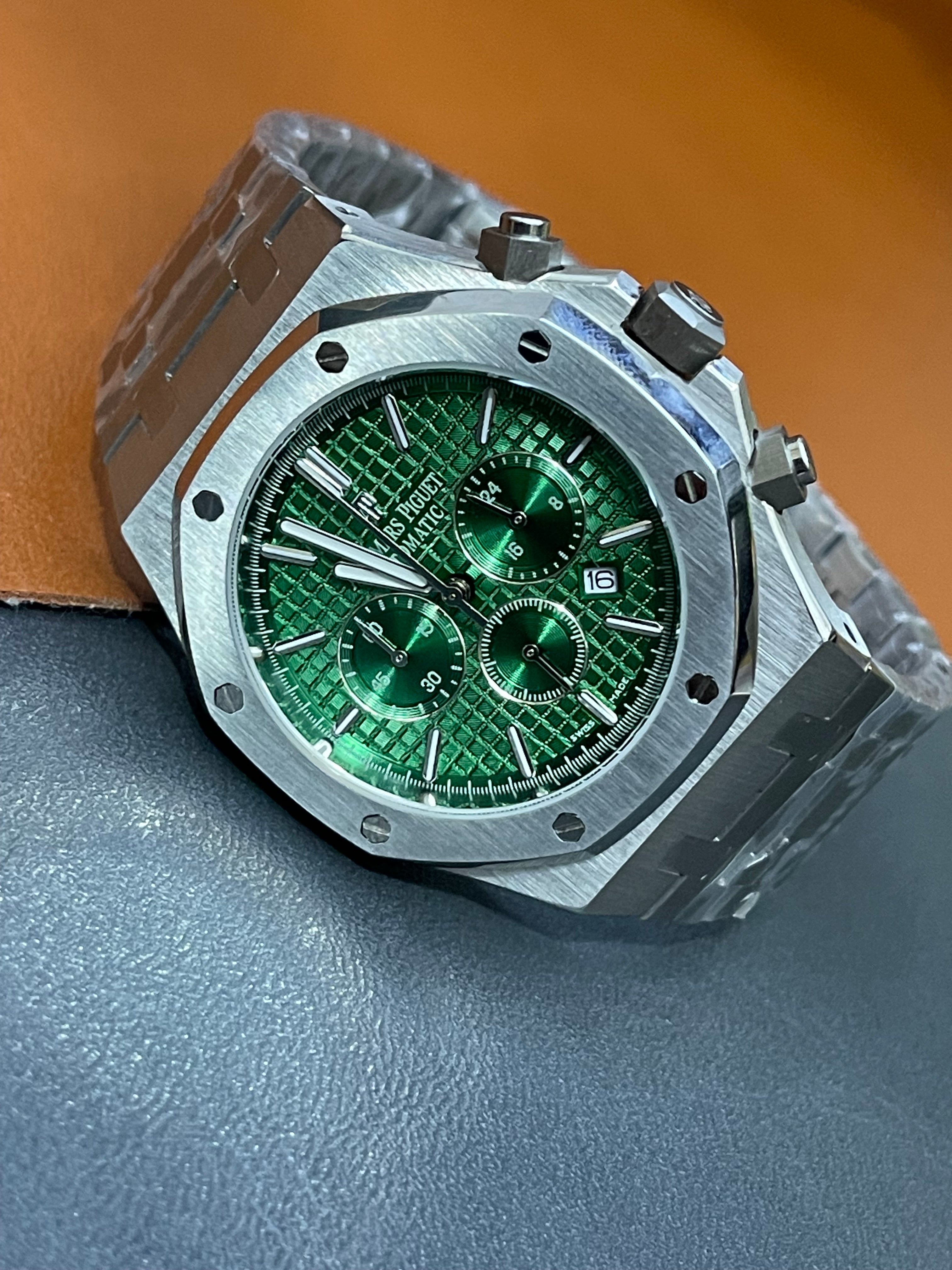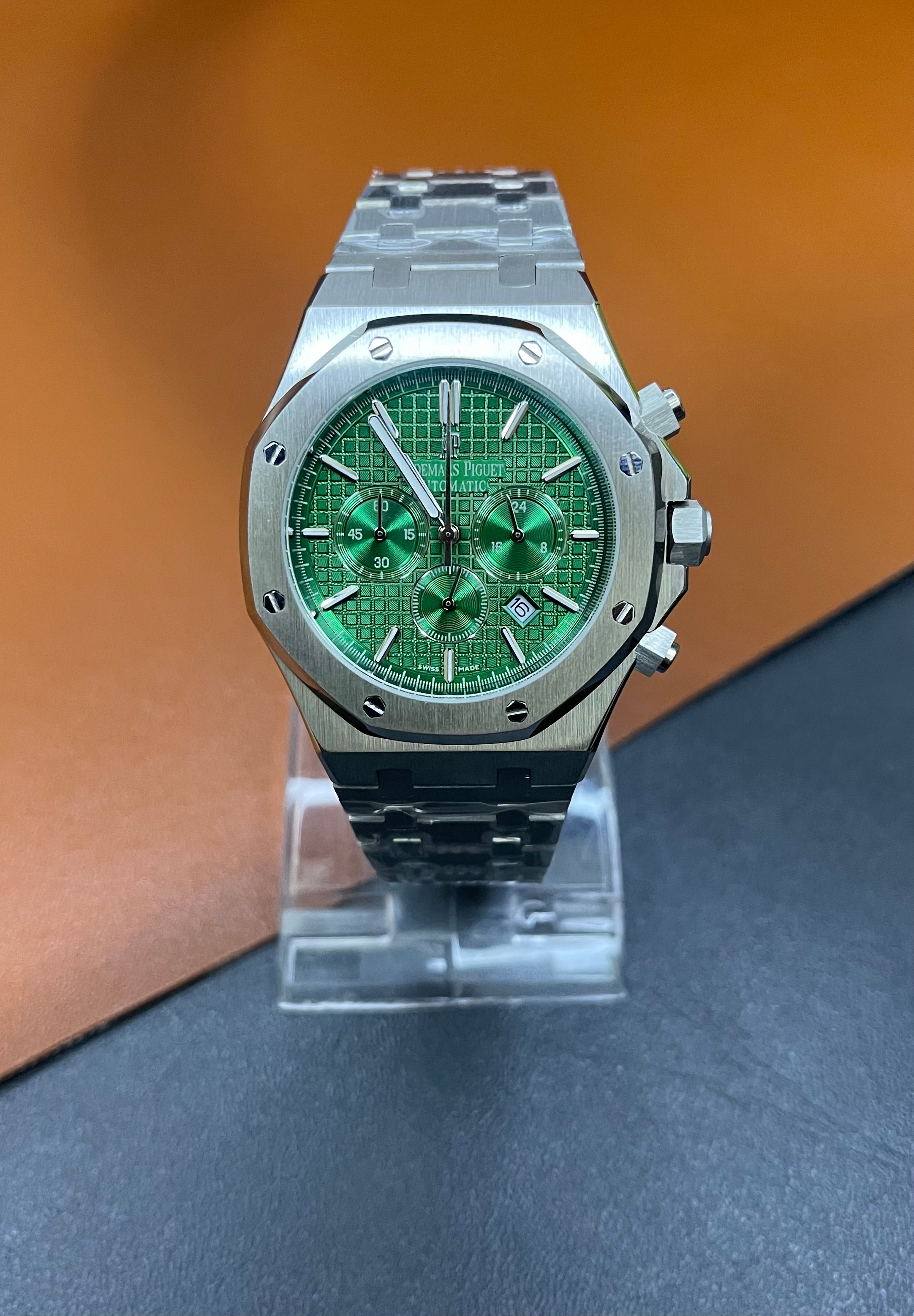 Bold and contemporary, the Royal Oak Green Dial Chronograph Watch features a rich green dial paired with a brushed stainless steel case and integrated bracelet. Powered by a reliable quartz chronograph movement, it offers precise timekeeping and stopwatch functionality with effortless daily wearability.
