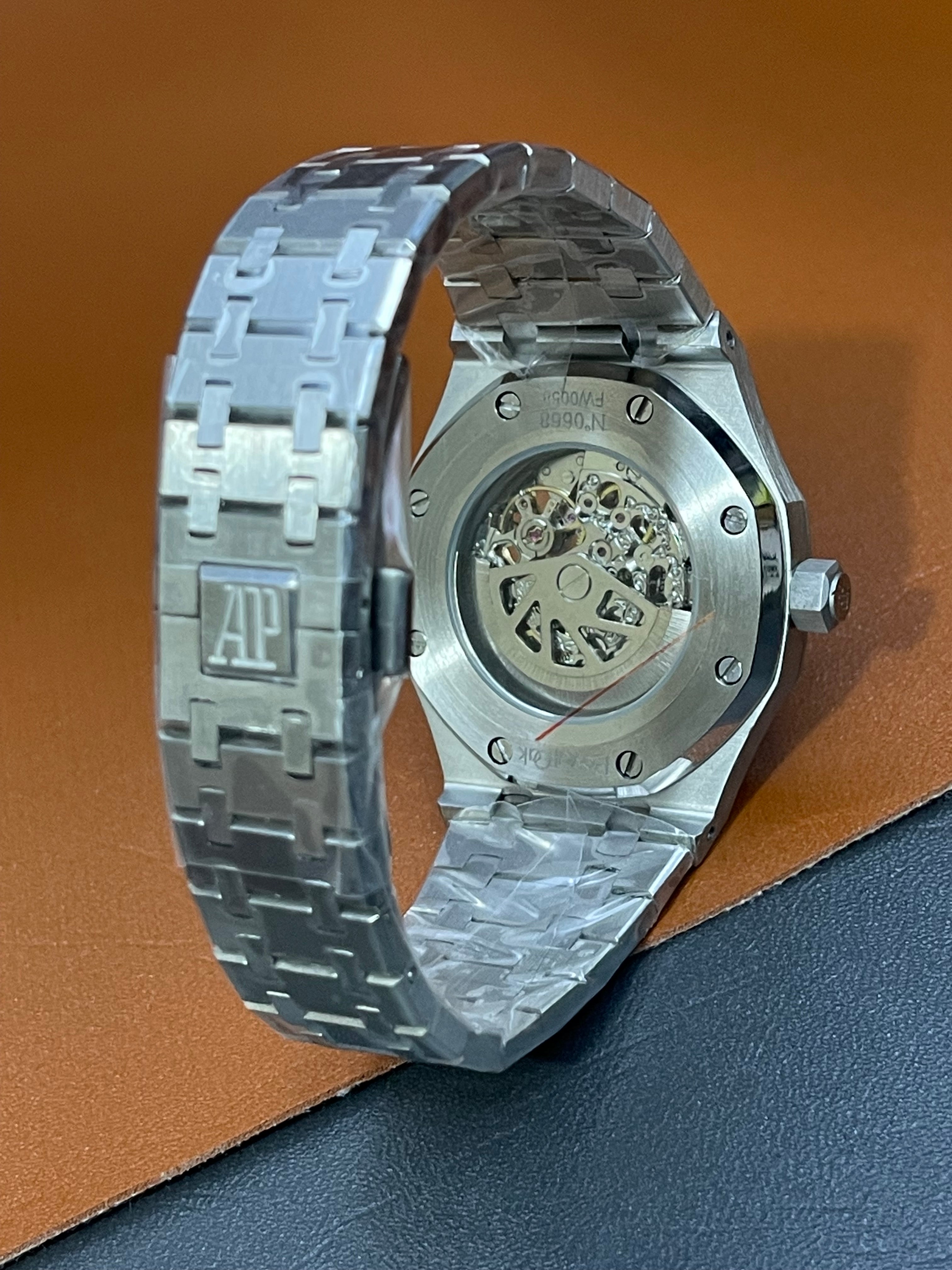Bold, technical, and visually striking, the Royal Oak Skeleton Watch features a dramatic black open-worked (skeleton) dial that reveals the intricate mechanical movement beneath. Designed for true watch enthusiasts, this timepiece blends avant-garde engineering with iconic sports-luxury aesthetics.