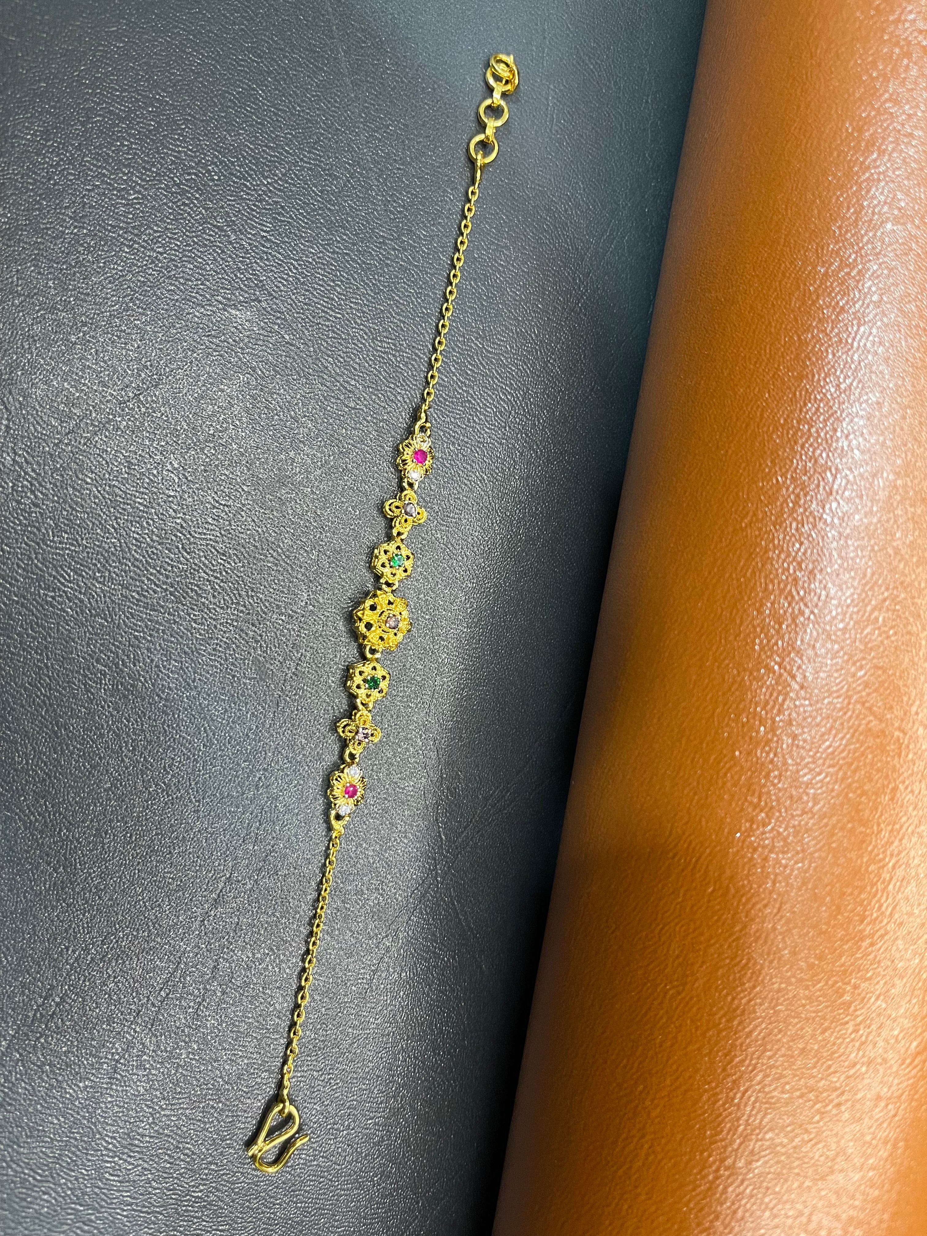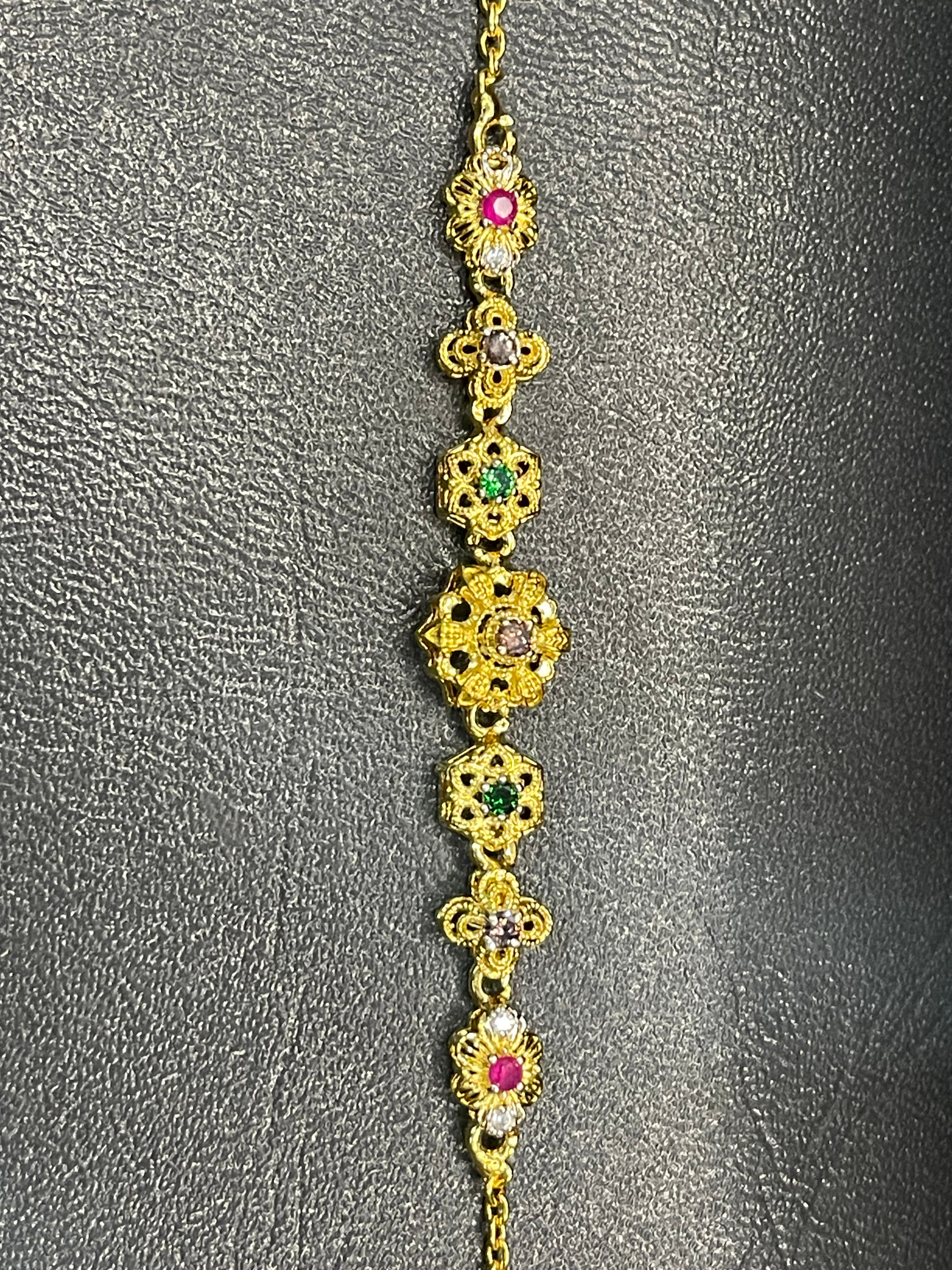 Bring color and elegance to your look with this seven-flower chain bracelet, crafted from high-quality 925 silver with gold plating. The bracelet features seven floral motifs with sparkling gemstones: 2 red flowers, 2 green flowers, and 3 purple flowers, arranged along a delicate chain for a harmonious and vibrant design.
