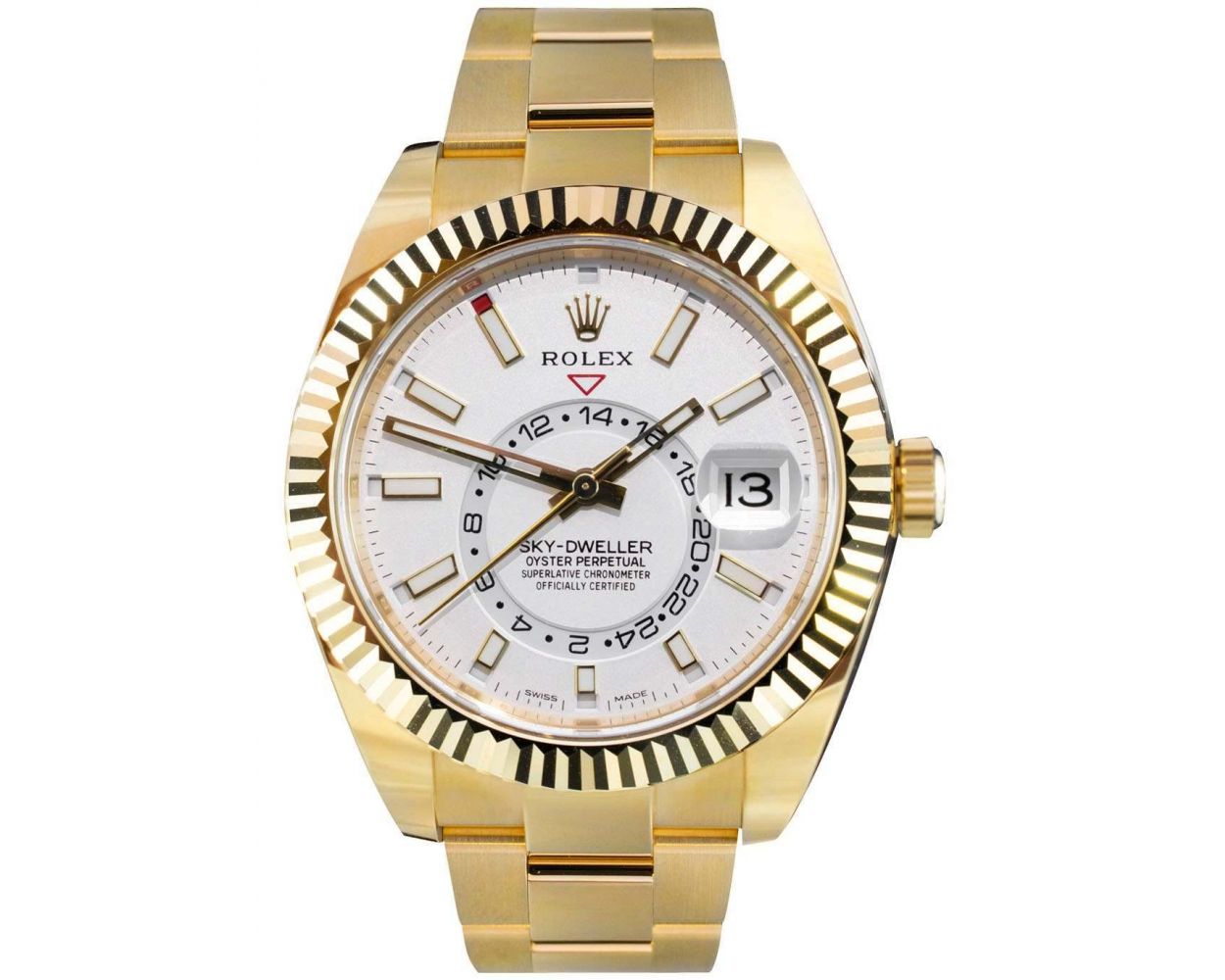 Make a statement of power and precision with this Sky-Dweller-inspired luxury watch, featuring a bold 42mm case in radiant 18K yellow gold tone and a clean, sophisticated white dial. Designed for world travelers and professionals, this timepiece offers a dual time zone display and annual calendar layout, combining elegance with utility.