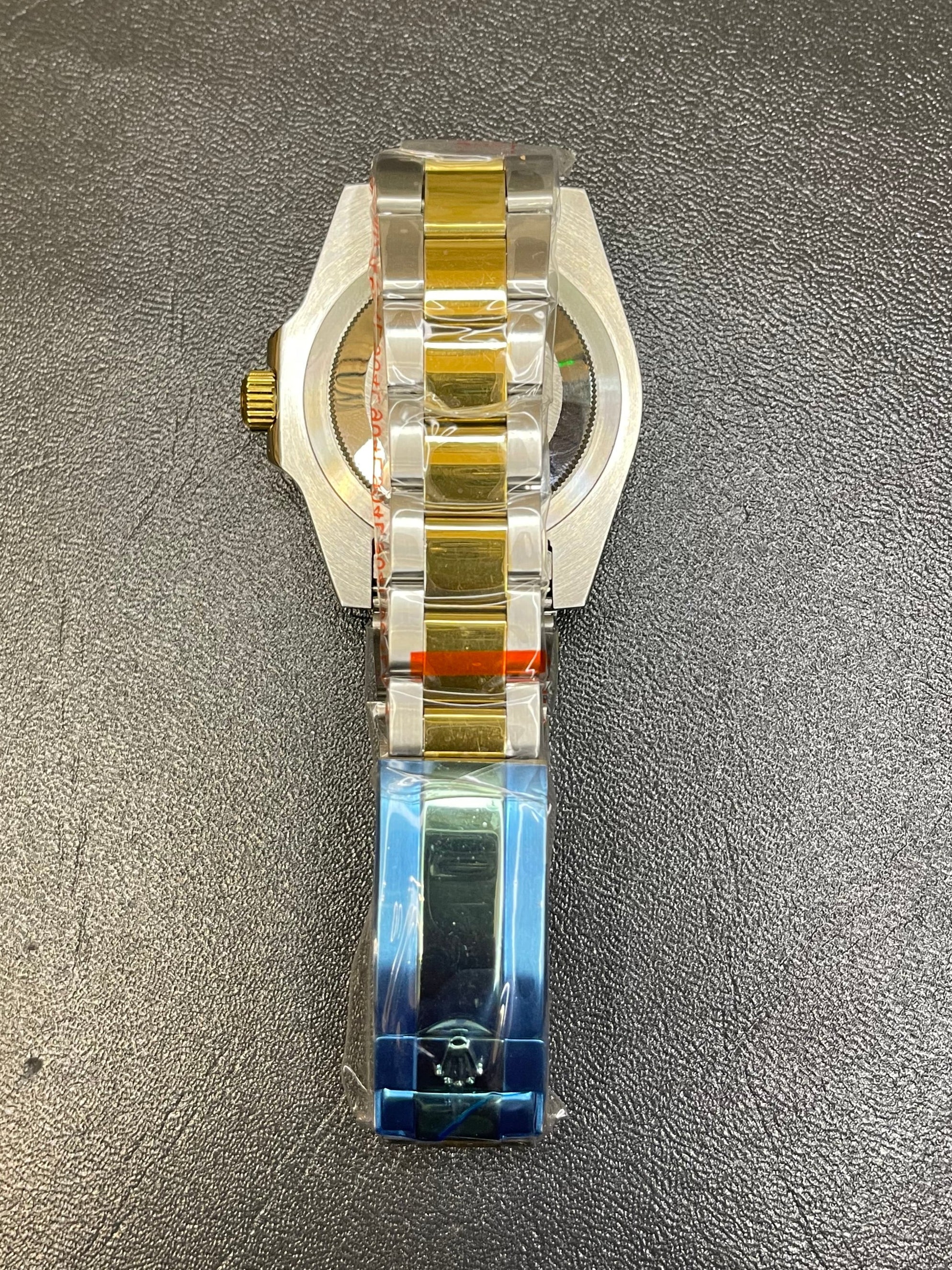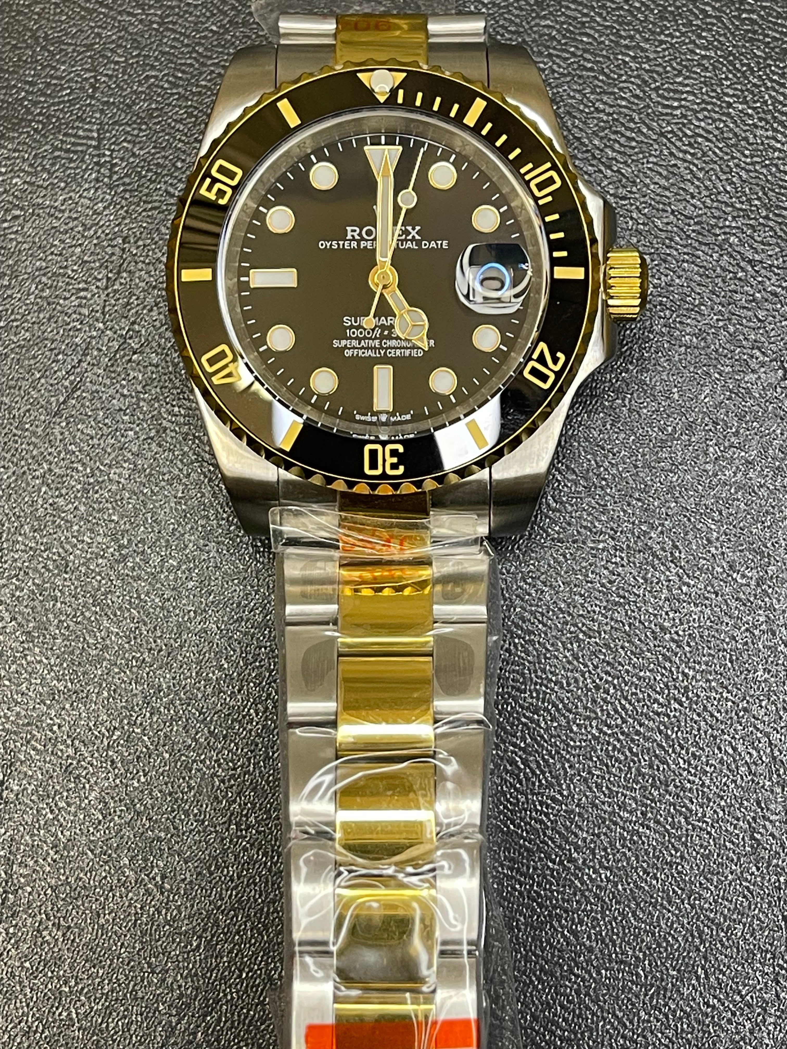 Command classic style with this Submariner Date-inspired watch, featuring a bold 41mm case, deep black dial, and a striking two-tone finish in gold and stainless steel. Designed with precision and performance in mind, this iconic style offers a rotating ceramic bezel, date window with cyclops lens, and a refined Oyster-style bracelet for a perfect mix of sport and sophistication.