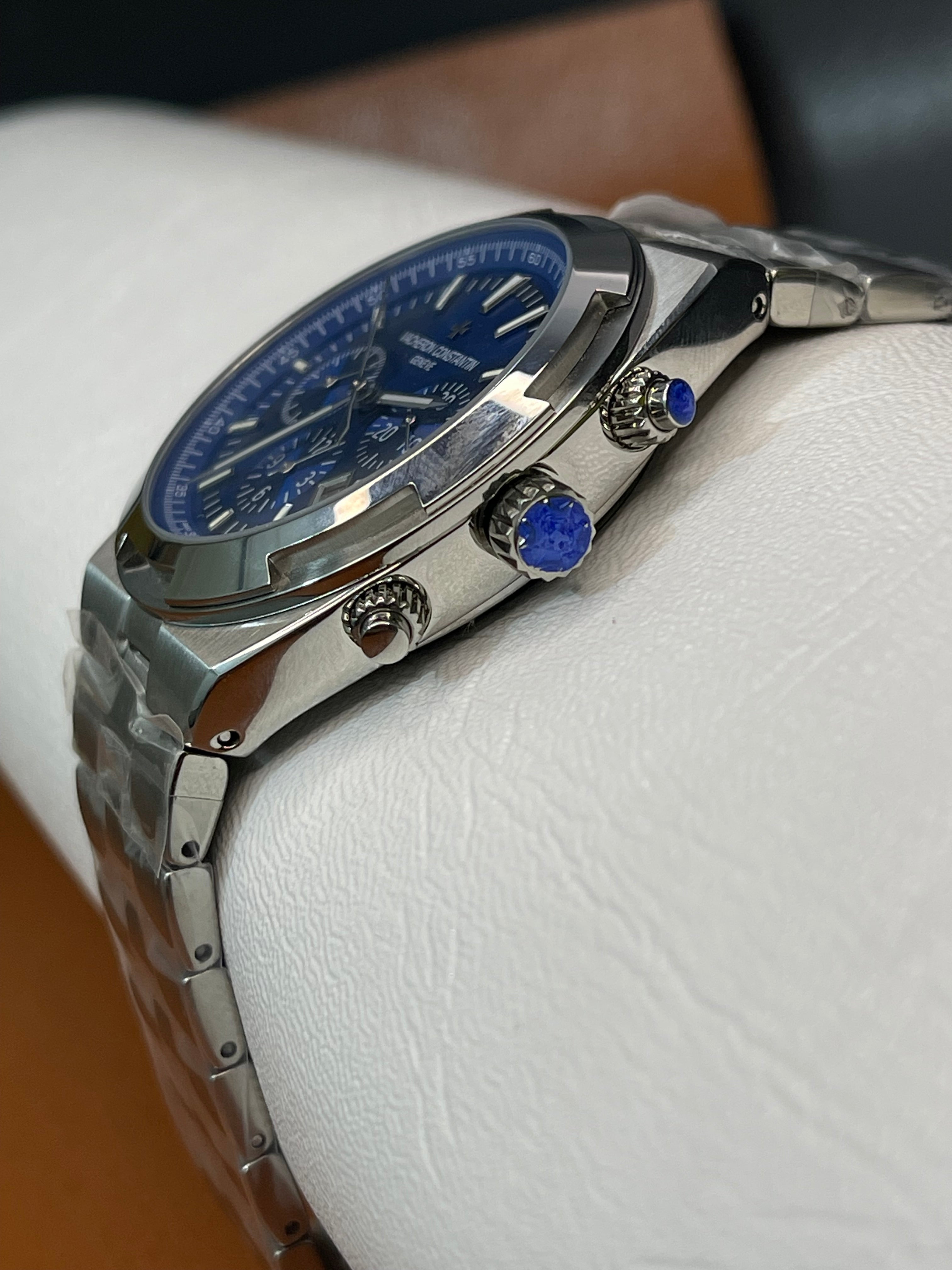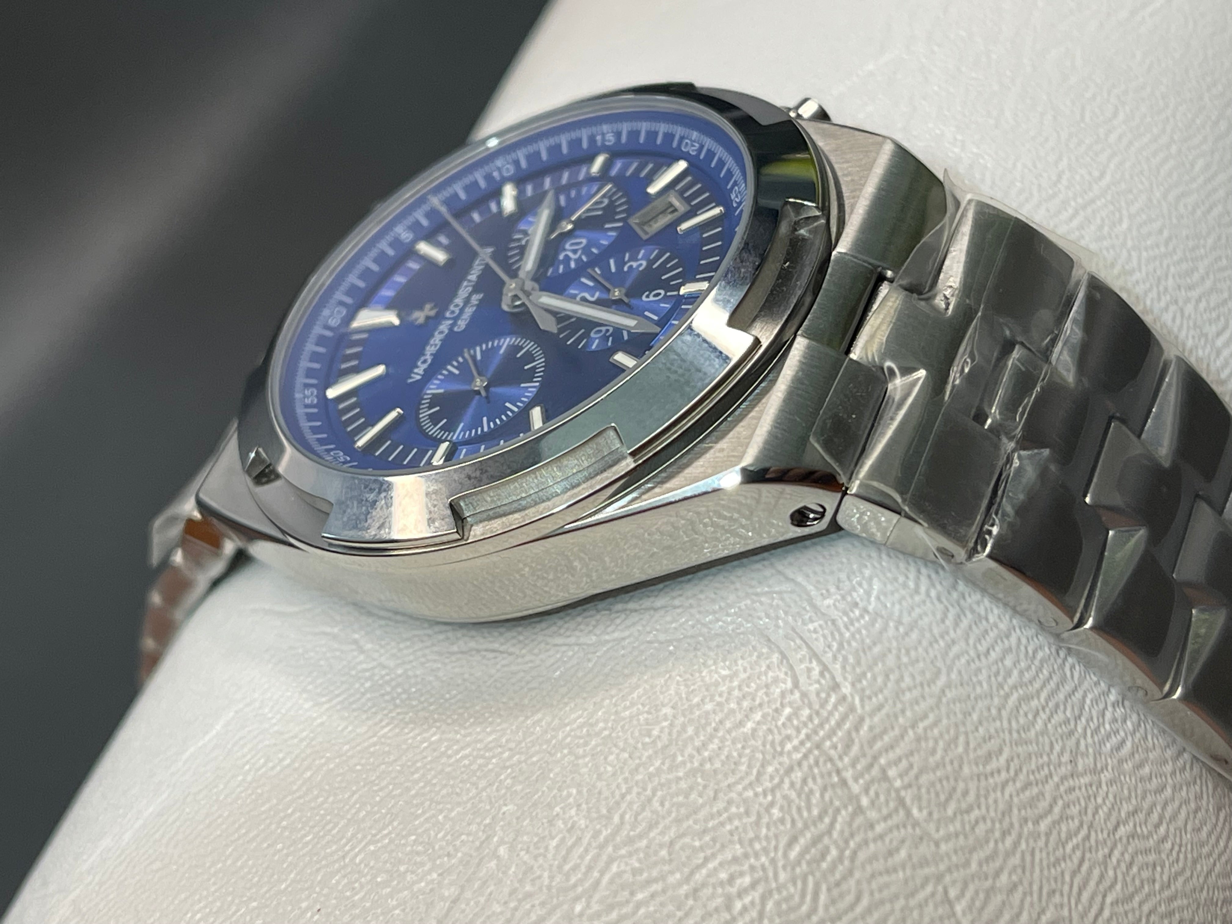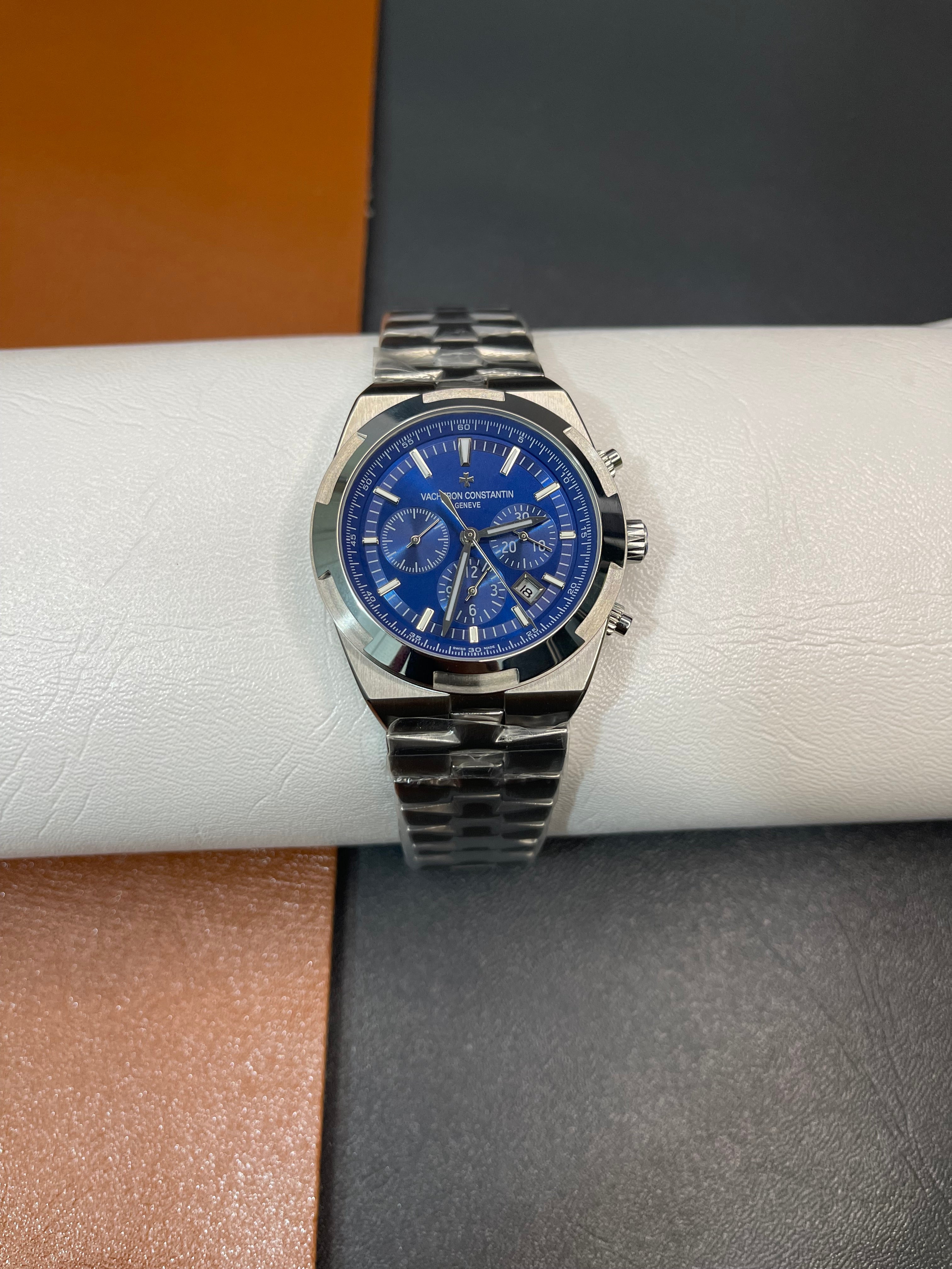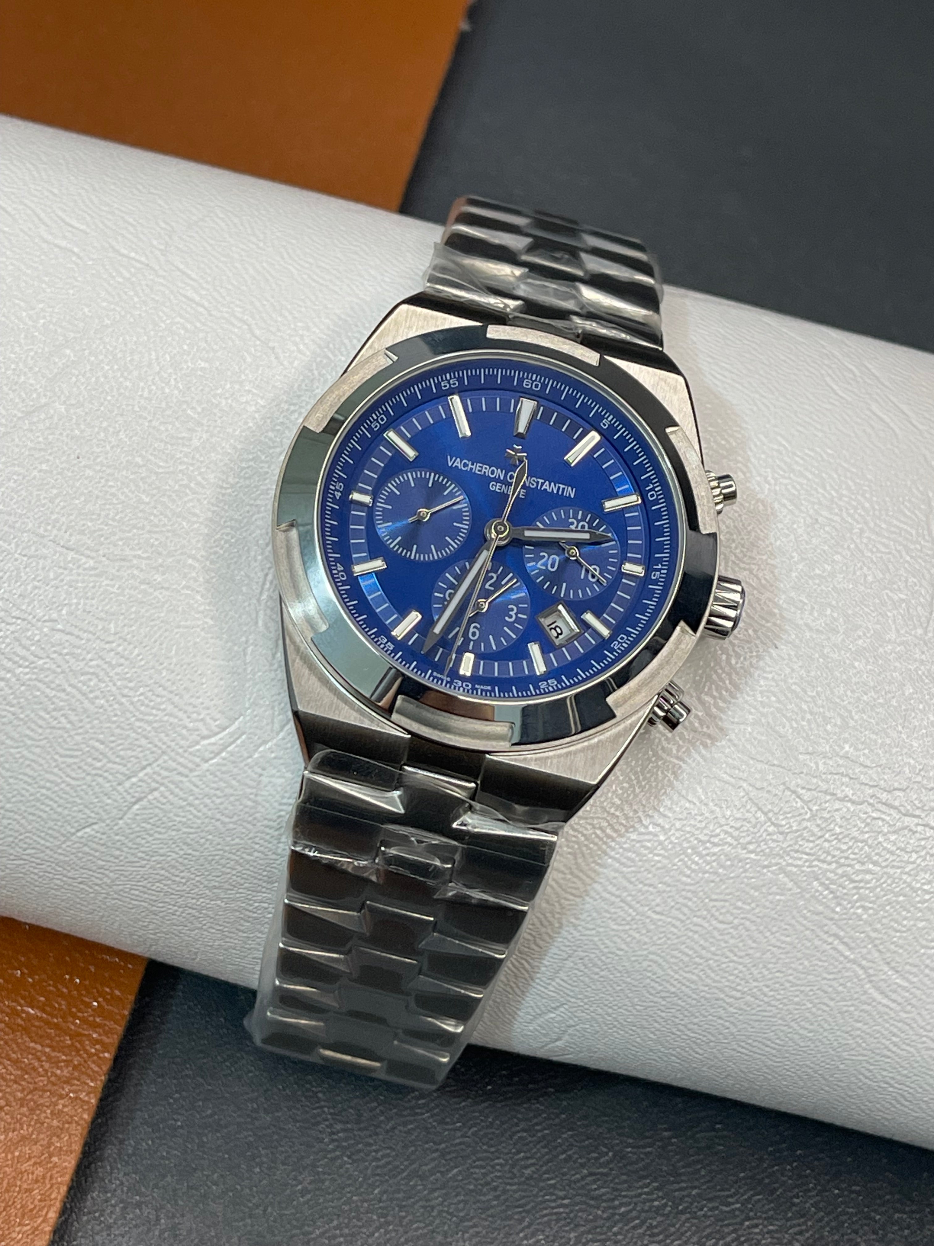 Experience the perfect fusion of precision, power, and luxury with this Overseas Chronograph Inspired Watch, crafted in a premium stainless-steel finish and featuring a bold 42.5mm case. The striking blue dial adds depth and elegance, while the detailed chronograph layout provides both style and functionality.