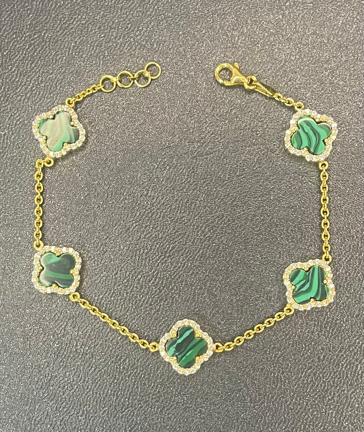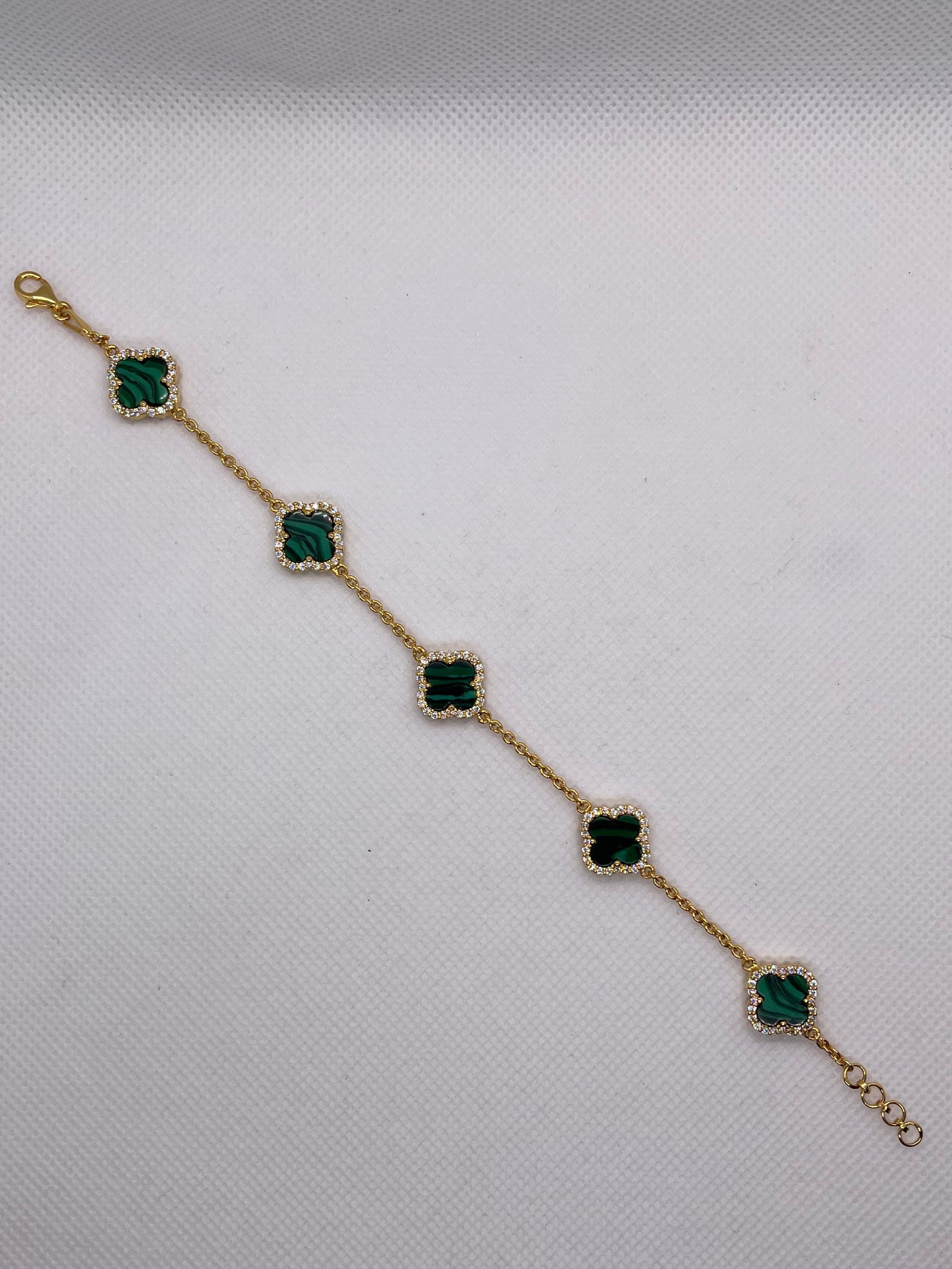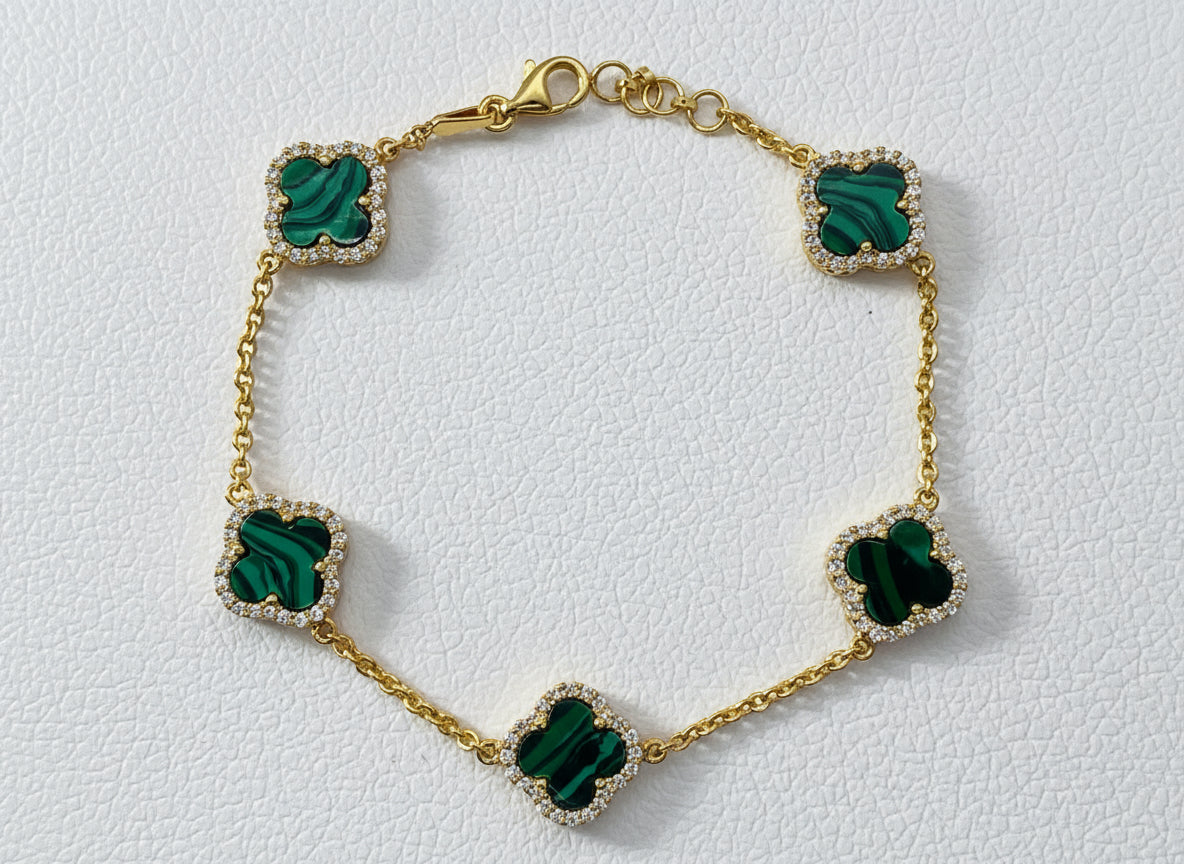 Van Cleef-Inspired Alhambra Green Malachite Bracelet – Gold Plated 925 Silver with Zircon Border | Time N Treasure