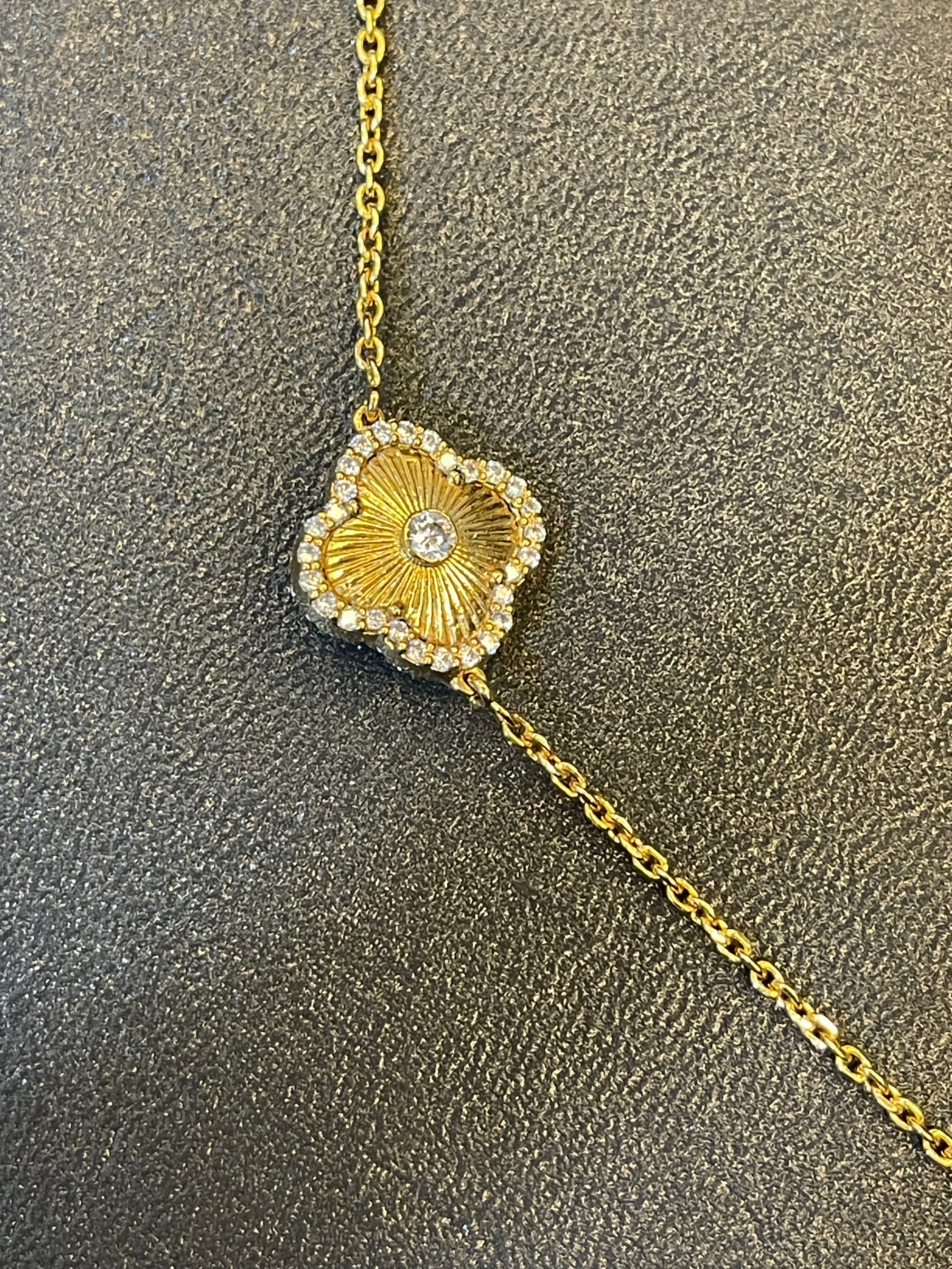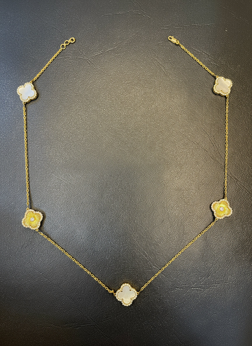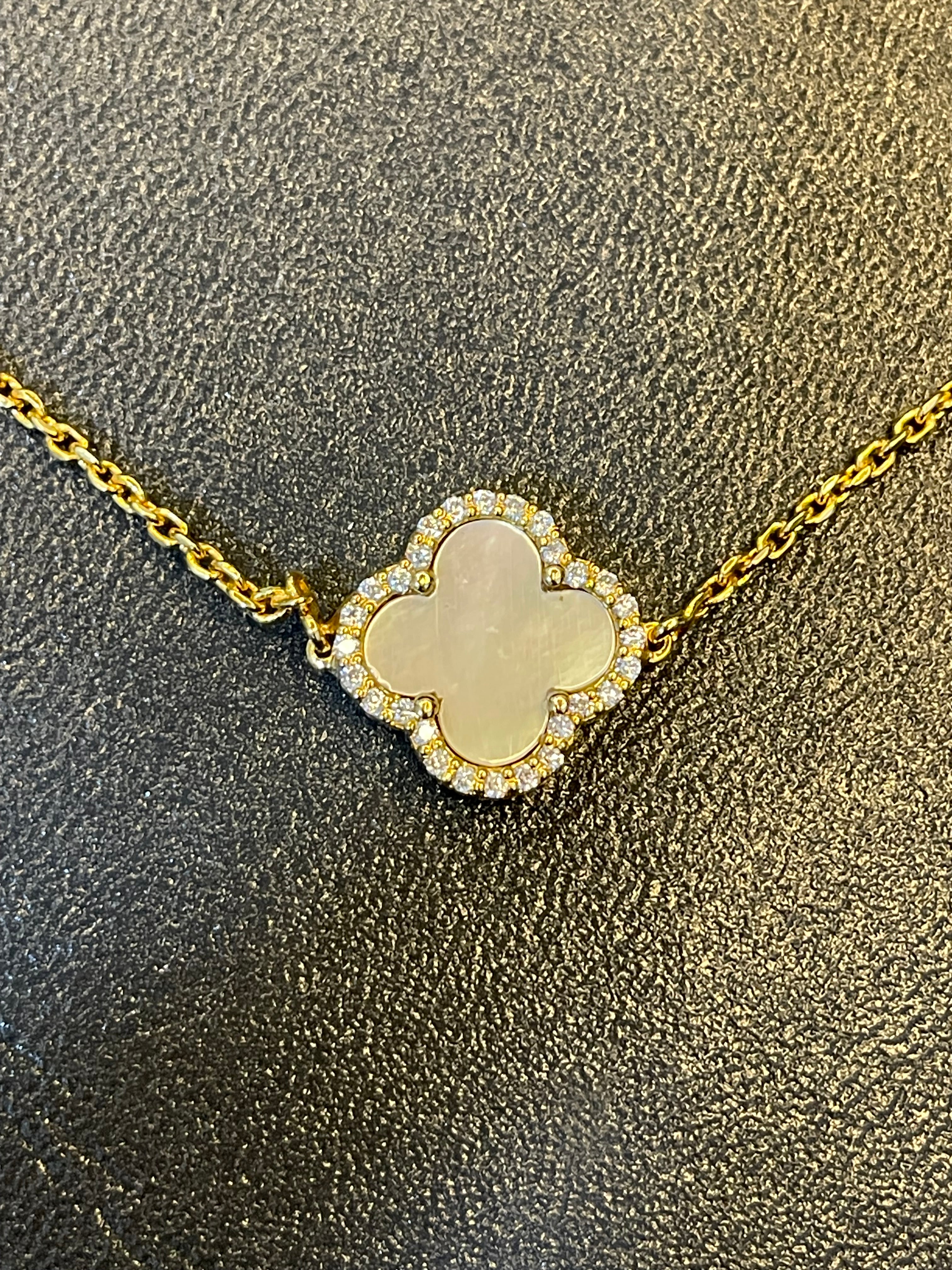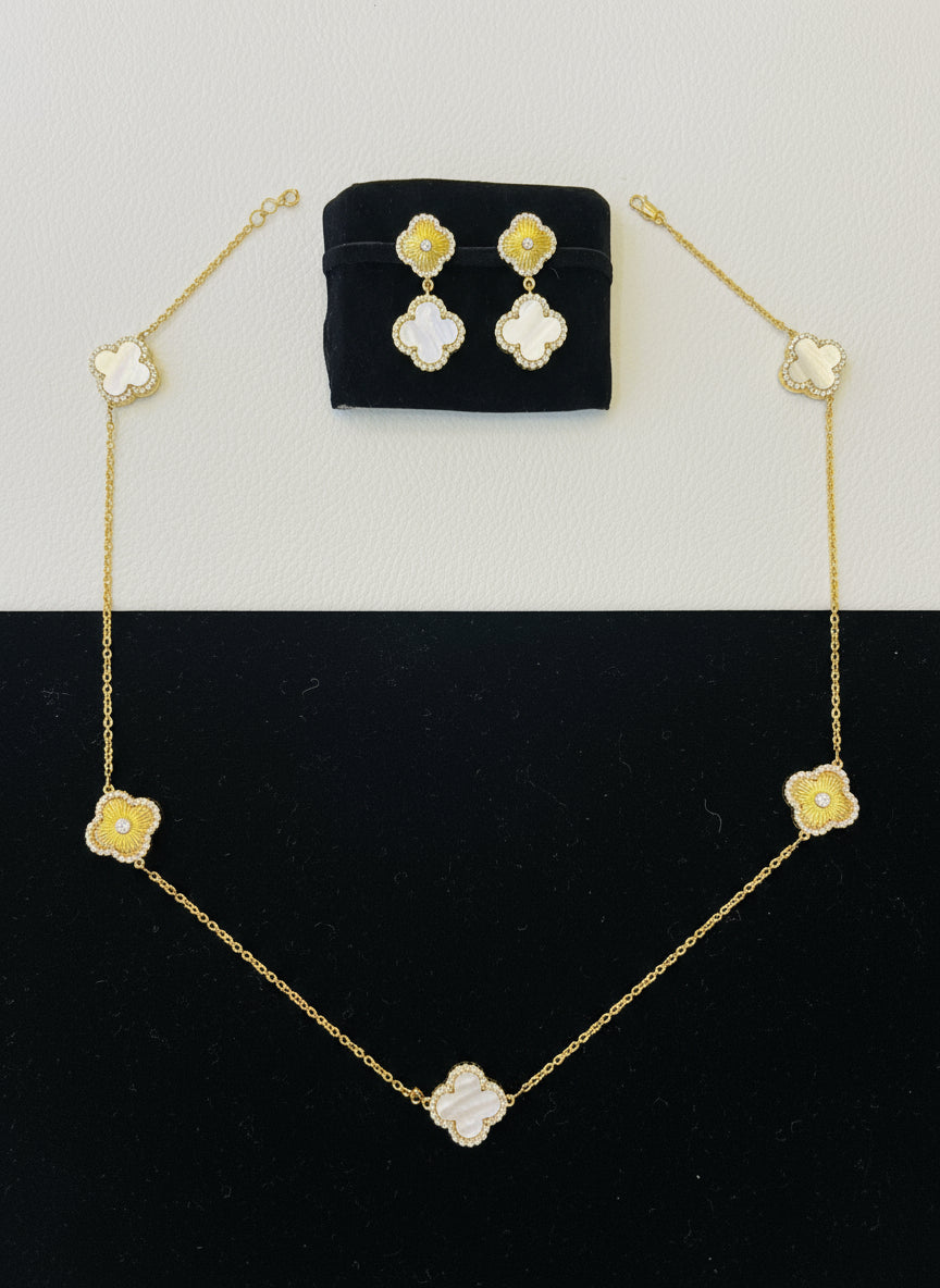 Experience timeless elegance with this Van Cleef Inspired Necklace Set, featuring a stunning mother of pearl stone in a classic plain clover design. Crafted from 925 sterling silver and finished with premium gold plating, this set includes a matching pair of tops, reflecting the signature sophistication of the Van Cleef Alhambra style. A perfect blend of simplicity, luxury, and grace — designed to elevate any outfit.